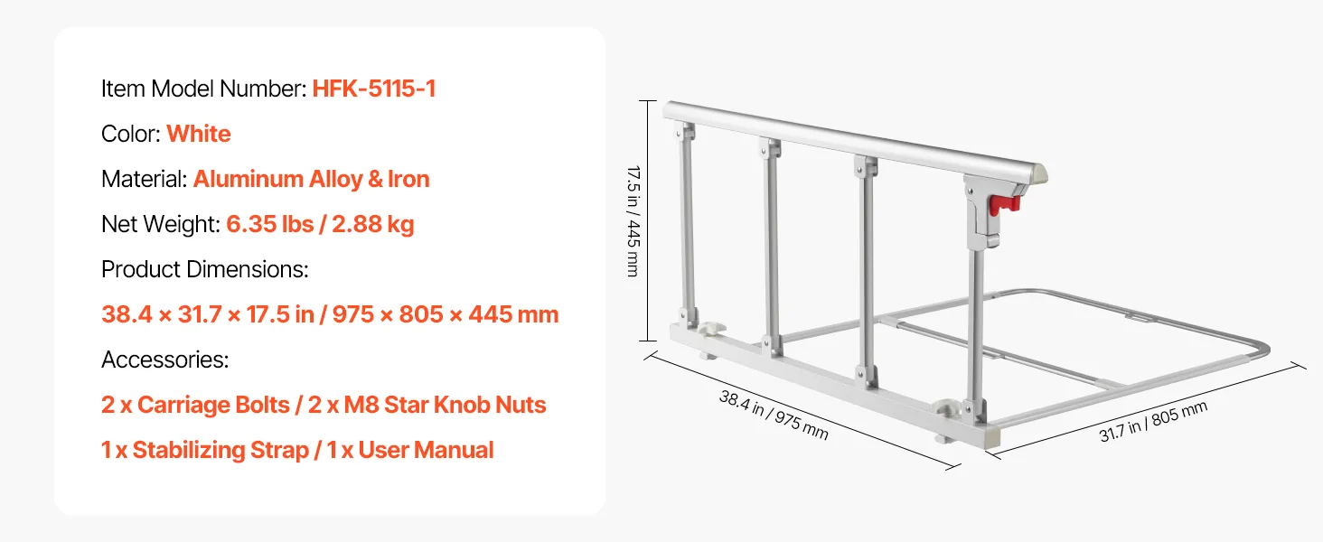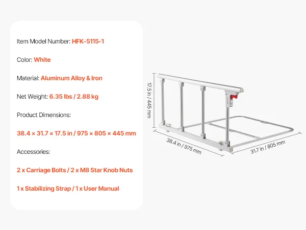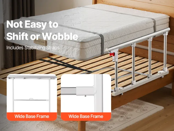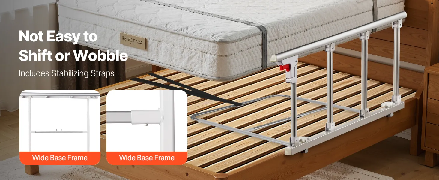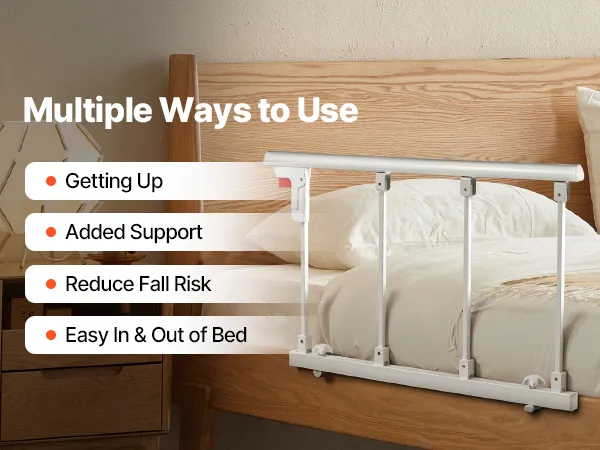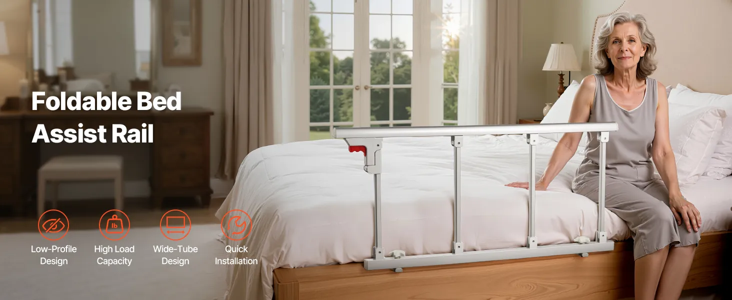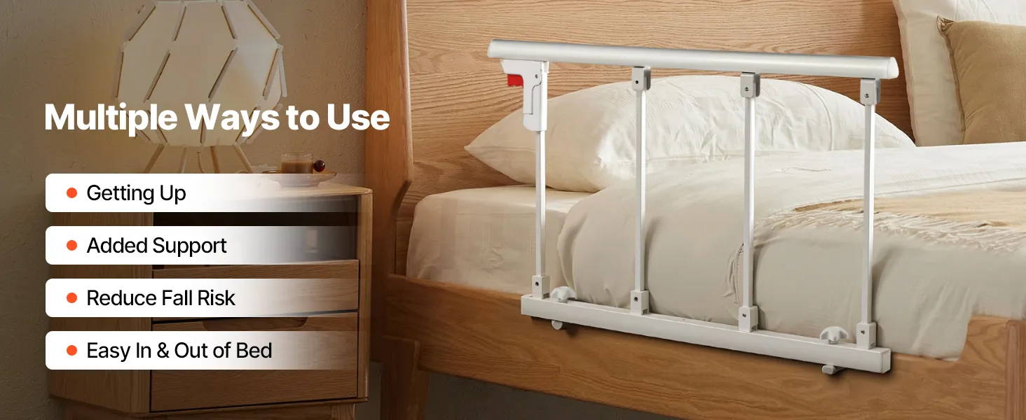 Składana konstrukcja: Gdy poręcz nie jest używana, wystarczy nacisnąć czerwony przycisk, aby ją złożyć. Taka konstrukcja nie utrudnia wsiadania i wysiadania, a także zmniejsza ryzyko uderzeń i potknięć. Pasuje do łóżek podwójnych, queen-size i king-size z materacami o szerokości 178–330 mm. Nie nadaje się do łóżek elektrycznych.