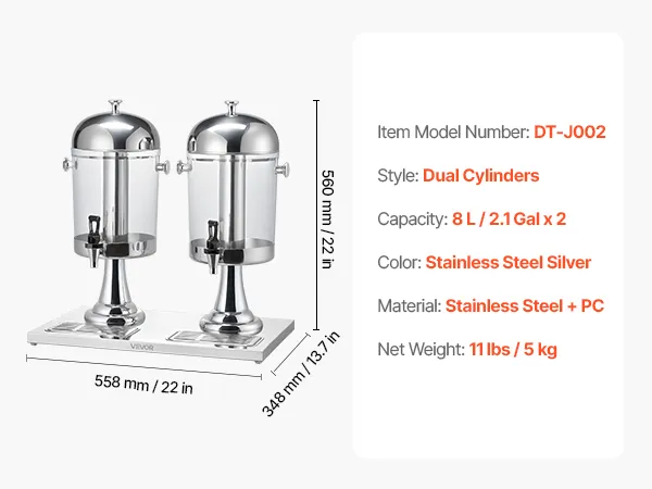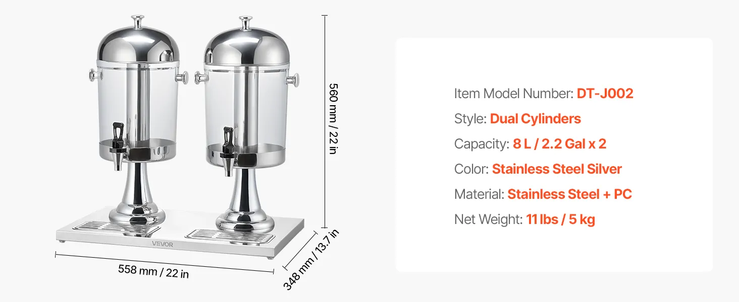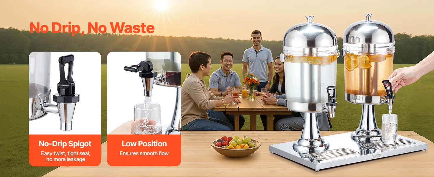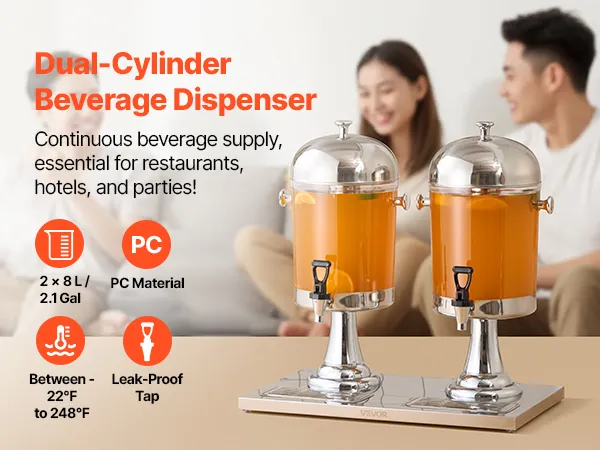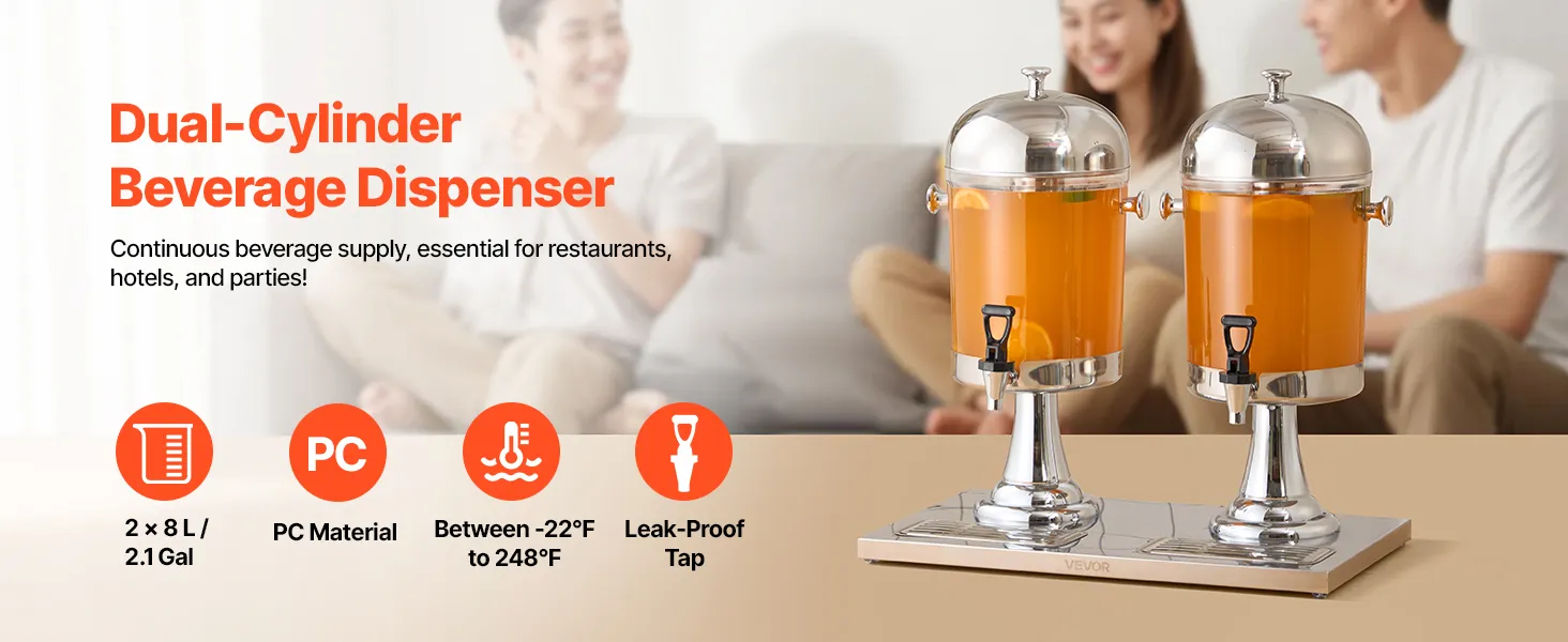 VEVOR Dystrybutor do napojów (2 x 8 l) na imprezy Dystrybutor soków (wykonany ze stali nierdzewnej + poliwęglanu) z kranem i podstawą zapobiegającą kapaniu Dystrybutor wody na imprezy restauracyjne, domowy dystrybutor napojów