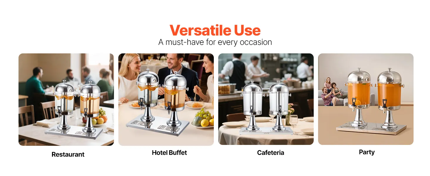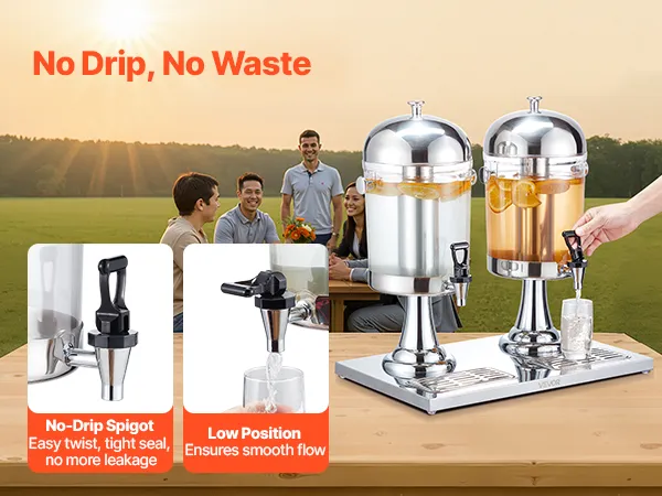 Duża pojemność: Dwucylindrowy dozownik napojów ma całkowitą pojemność 16 l (8 l na cylinder) i może przechowywać dwa rodzaje napojów. Zmniejsza częste uzupełnianie i zapewnia ciągłe zaopatrzenie dla ruchliwych restauracji, hoteli i przyjęć.