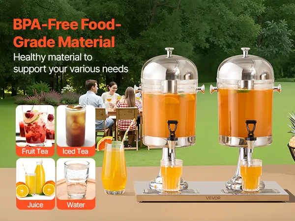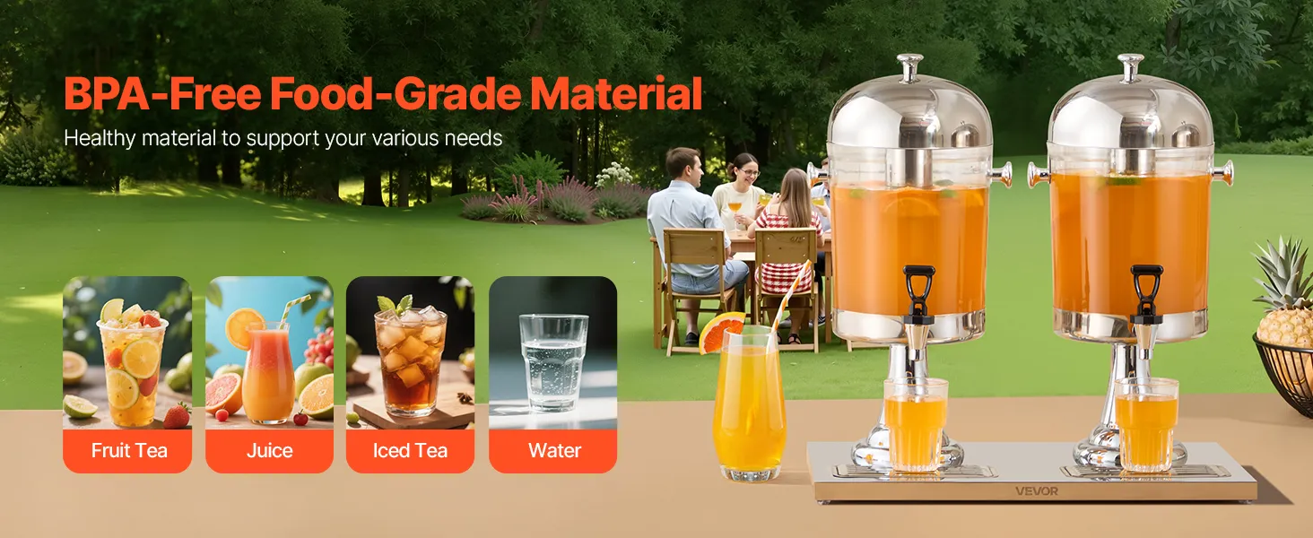 Dozownik soku wykonany jest z materiału PC klasy spożywczej, jest odporny na zabrudzenia, trwały i można go myć w zmywarce. Idealny do mrożonej herbaty, soku lub wody.
