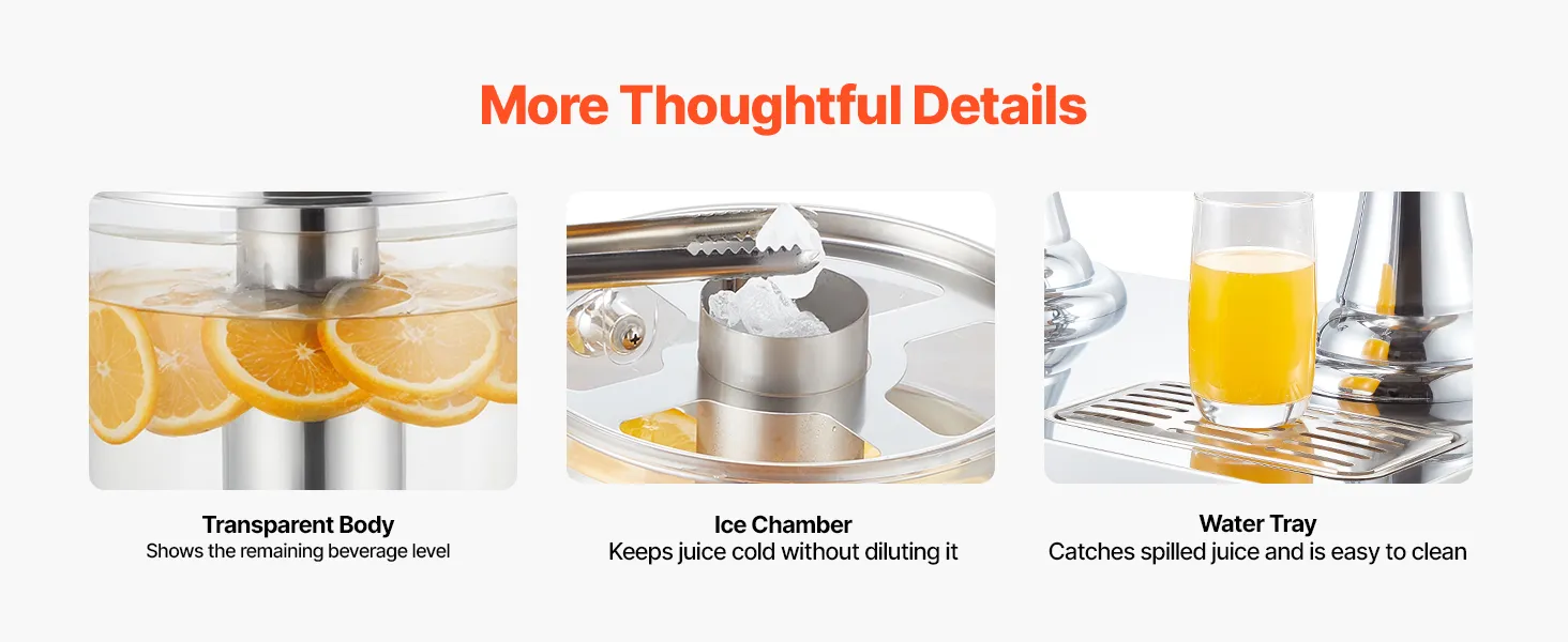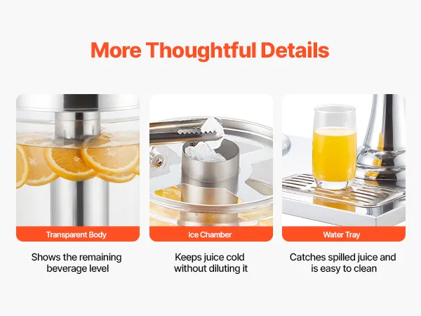 Doskonała prezentacja: Przezroczysta konstrukcja doskonale eksponuje Twoje soki lub napoje. Komora na lód pozwala na dodanie kostek lodu, aby napoje pozostały chłodne bez rozcieńczania ich. Idealne do prezentacji herbaty owocowej, mrożonej herbaty, soku, wody i innych.