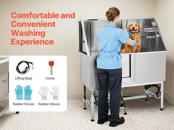 Pełne wyposażenie: Ta stacja do mycia psów jest wyposażona w głowicę prysznicową, kran i bezpośrednie podłączenie do węża domowego, co zapewnia trwałość. W zestawie znajduje się również ściereczka do czyszczenia, ściągaczka, szczotka i rękawiczki, aby Twój pupil mógł w pełni cieszyć się kąpielą.