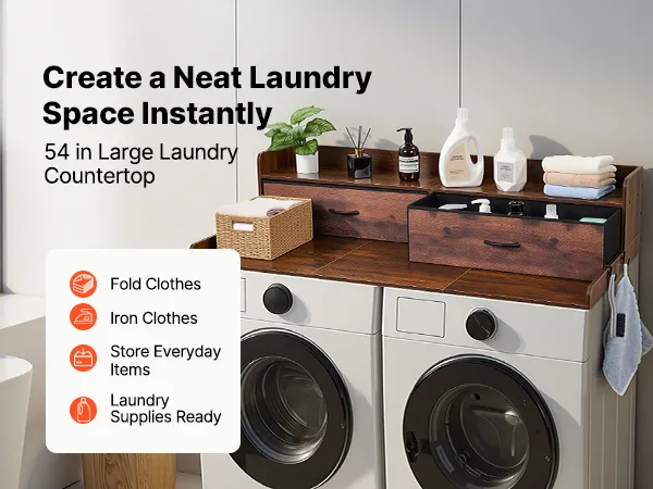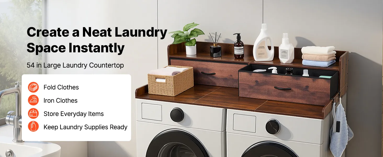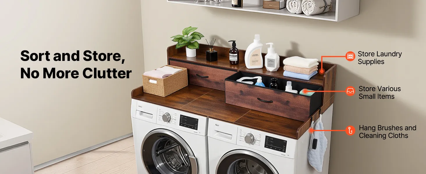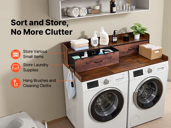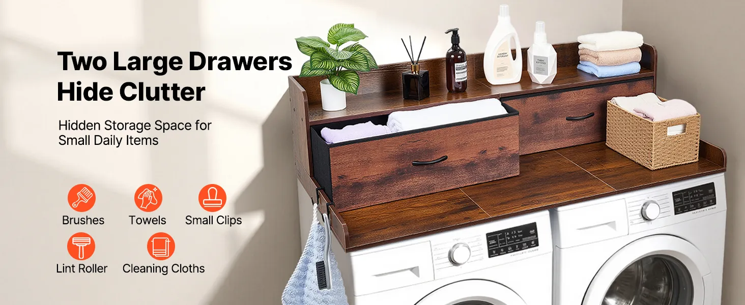 Blat roboczy VEVOR do pralki i suszarki (137 x 69,9 cm) z półką, 2 szufladami i haczykami, do szafki na pościel, spiżarni, blatu kuchennego, udźwig 113 kg, brązowy, miejsce do przechowywania detergentów