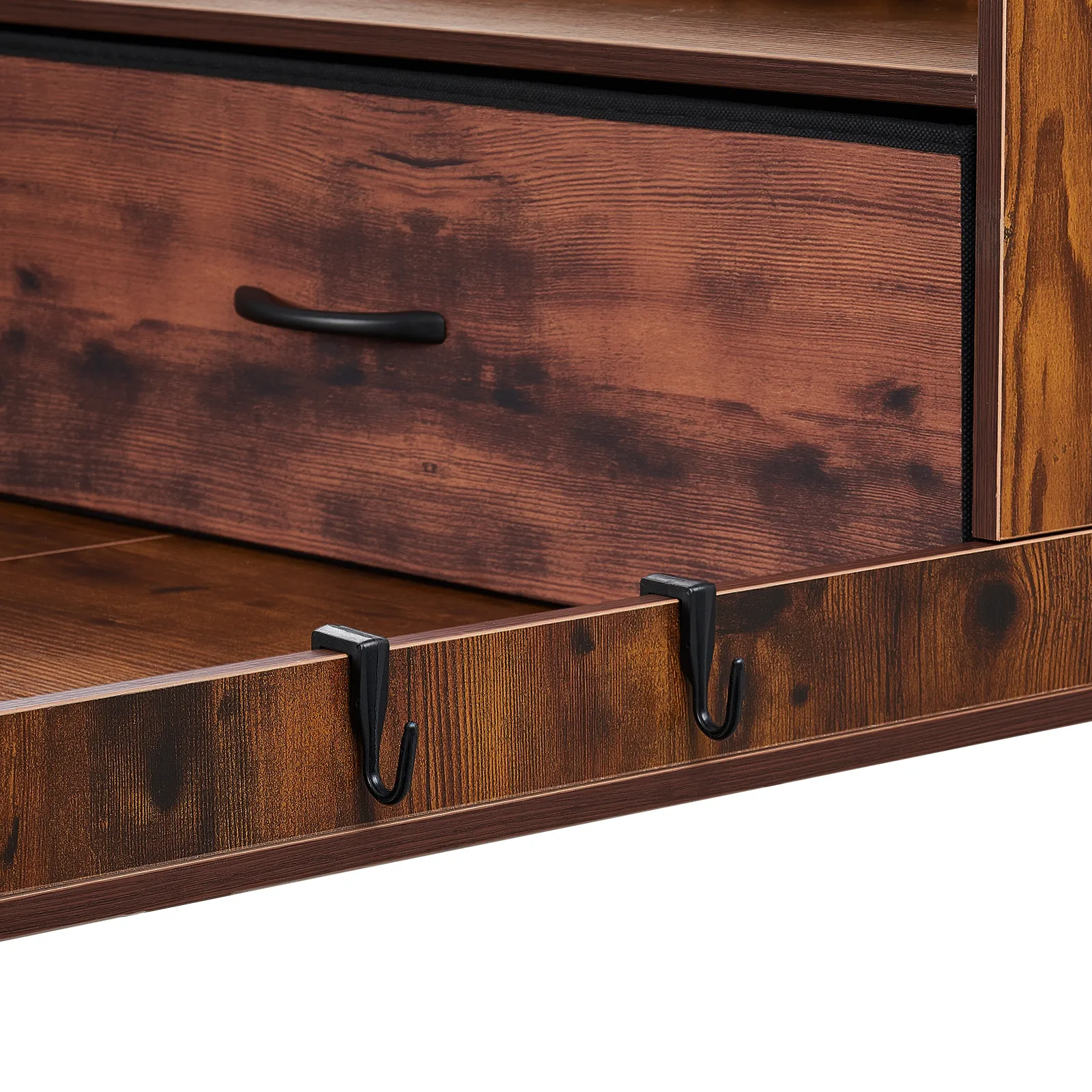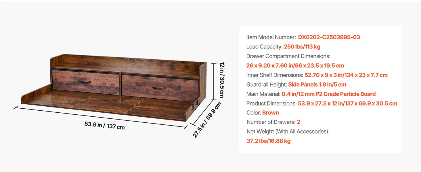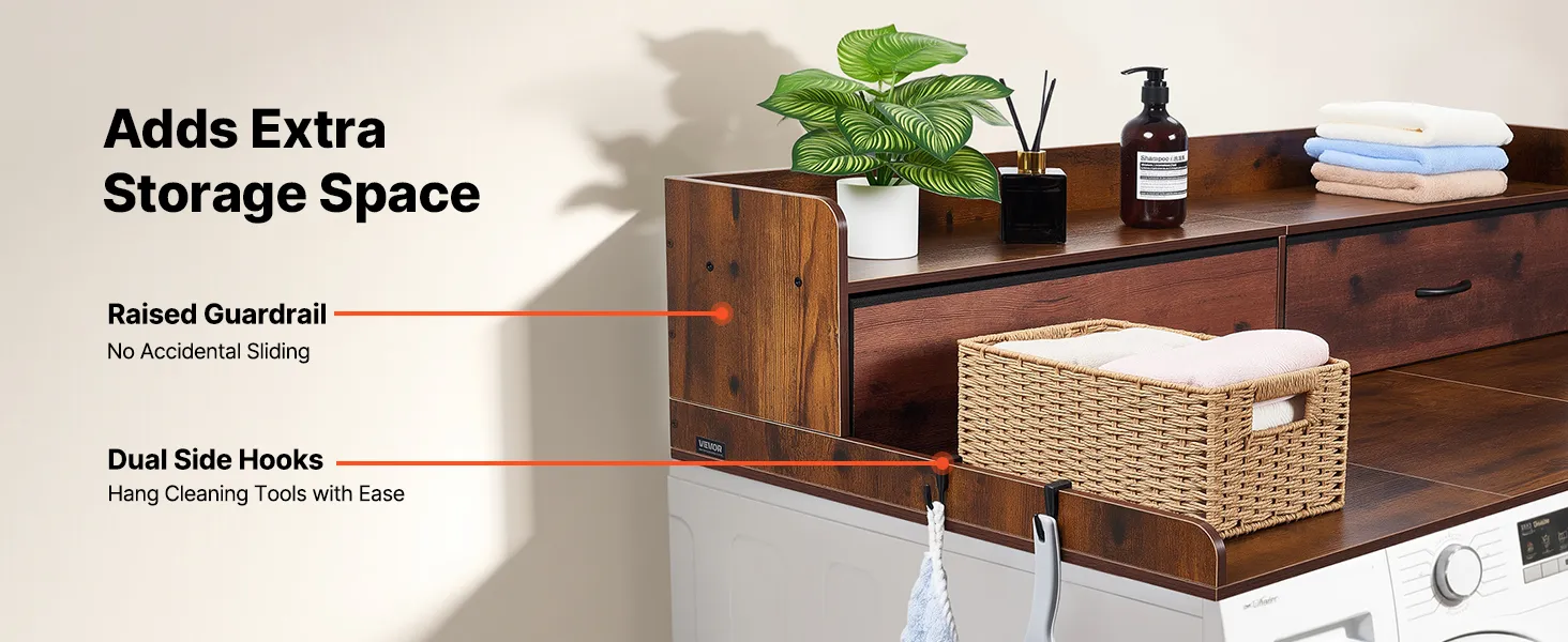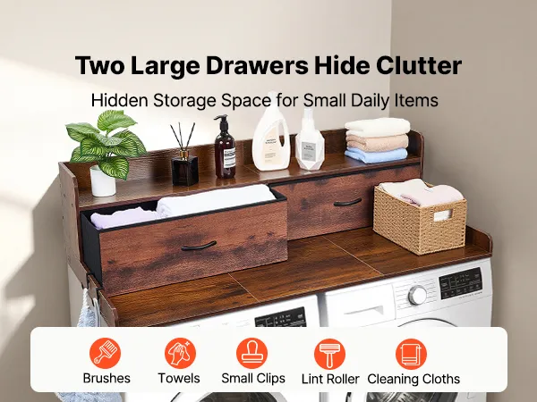 Blat roboczy VEVOR do pralki i suszarki (137 x 69,9 cm) z półką, 2 szufladami i haczykami, do szafki na pościel, spiżarni, blatu kuchennego, udźwig 113 kg, brązowy, miejsce do przechowywania detergentów