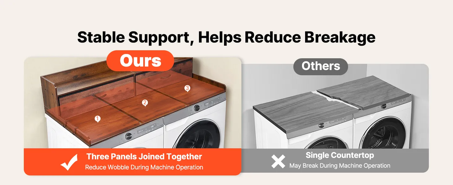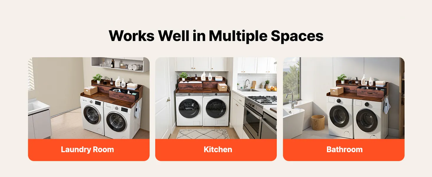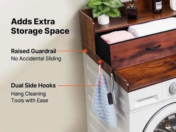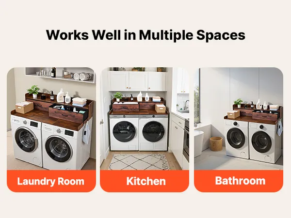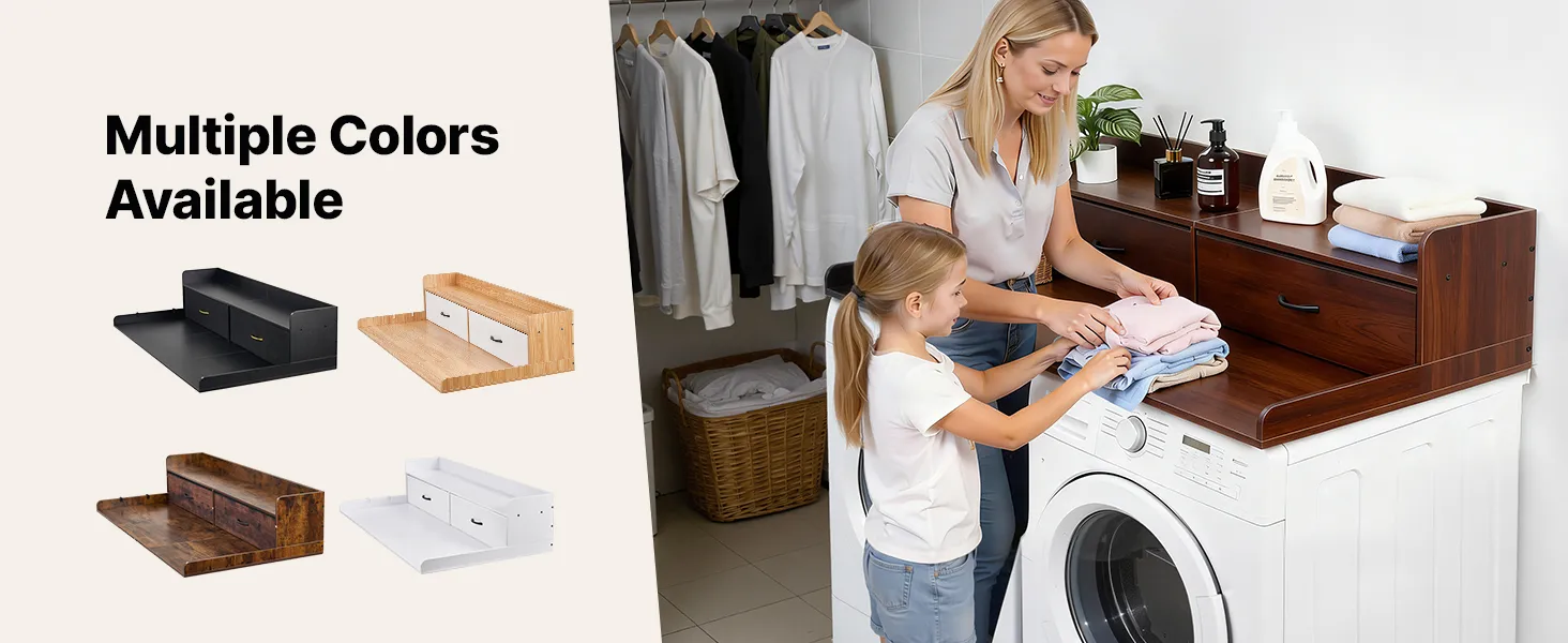 • Wielofunkcyjne przechowywanie: Ten blat pralko-suszarki wyposażony jest w dwie duże szuflady, półkę, boczne haczyki i dużą powierzchnię do przechowywania detergentów, ręczników, spinaczy, rzeczy składanych i prasowanych.
