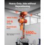 Elektryczny wciągnik łańcuchowy VEVOR podnosi ładunki o masie do 2000 kg (4400 funtów) i charakteryzuje się płynnie działającym podwójnym systemem łańcuchowym oraz wysokością podnoszenia 6 m (20 stóp). Wózek umożliwia przemieszczanie się wzdłuż belki, a dwustopniowa regulacja prędkości z obsługą przewodową i bezprzewodową umożliwia szybkie i precyzyjne pozycjonowanie. Funkcje bezpieczeństwa i łańcuchy G100 gwarantują niezawodną pracę.