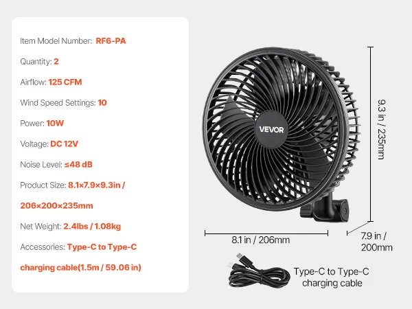 Wentylator do uprawy roślin VEVOR z klipsem, oscylacyjny, wentylator z klipsem 10 W ze złączem USB, 9 ustawień prędkości i trybem cyrkulacji, wentylator cyrkulacyjny do cyrkulacji powietrza i chłodzenia w growboxach i namiotach, opakowanie 2 szt.