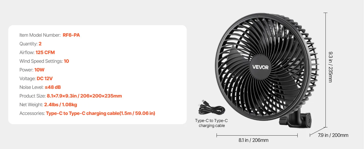 Elastyczne zasilanie: Zawiera dwa kable USB-C o długości 1,5 m, kompatybilne z powerbankami i źródłami zasilania DC. Ten mocowany na klips wentylator zapewnia elastyczne zasilanie i uporządkowane zarządzanie kablami w namiotach uprawowych.