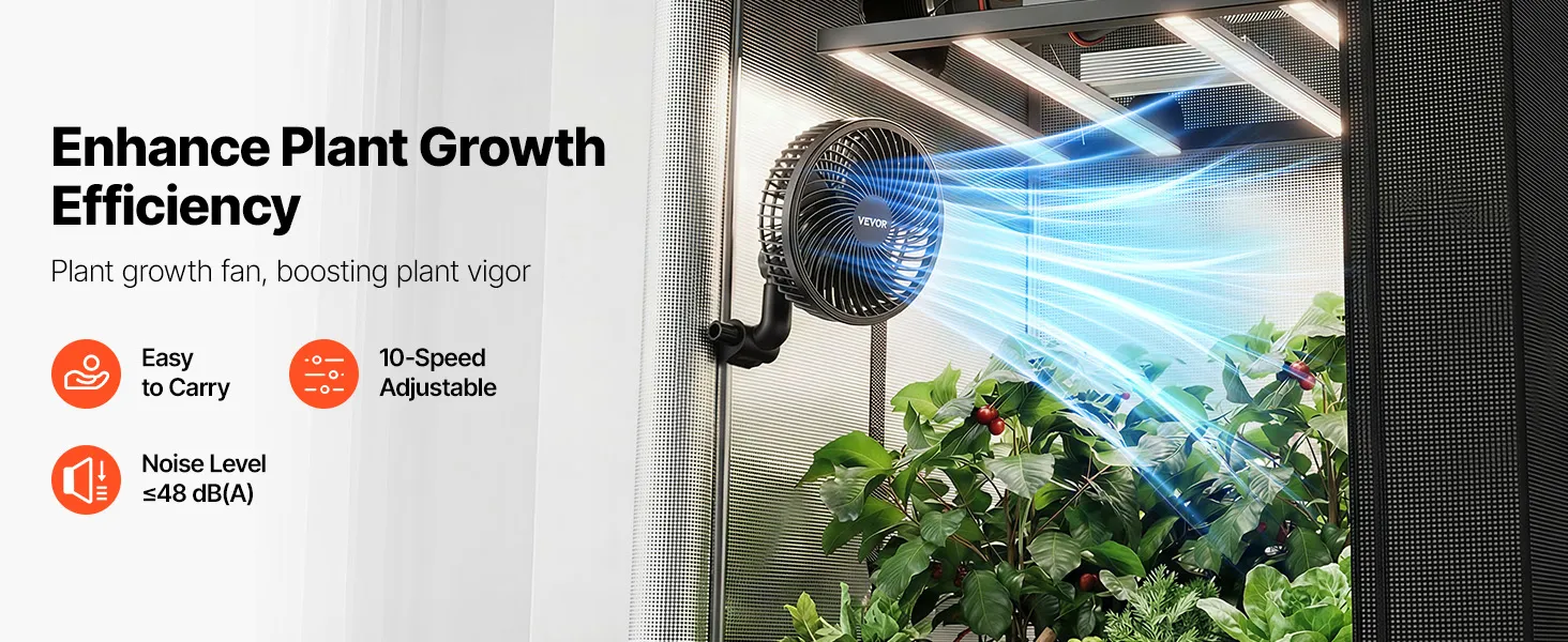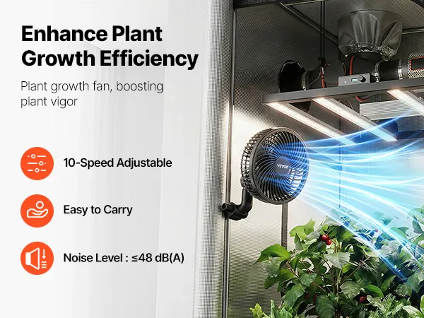 Ten wentylator został zaprojektowany specjalnie do namiotów uprawowych i oferuje 10 trybów przepływu powietrza. Dzięki przepływowi powietrza 125 CFM, wentylator ten wspomaga równomierne oddychanie liści i zapobiega nierównomiernemu wzrostowi spowodowanemu przez zastoje powietrza.