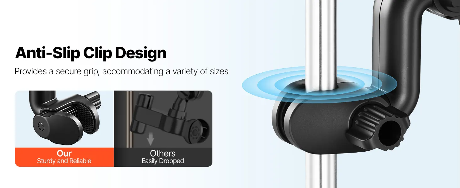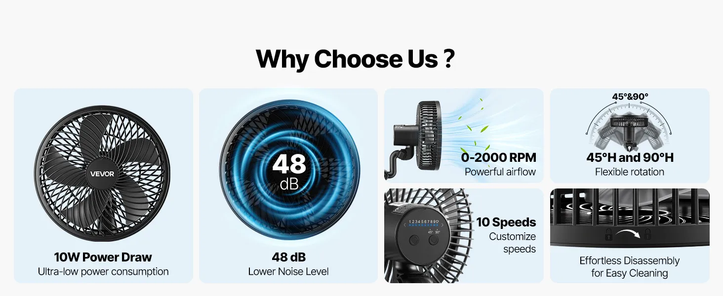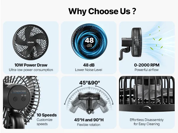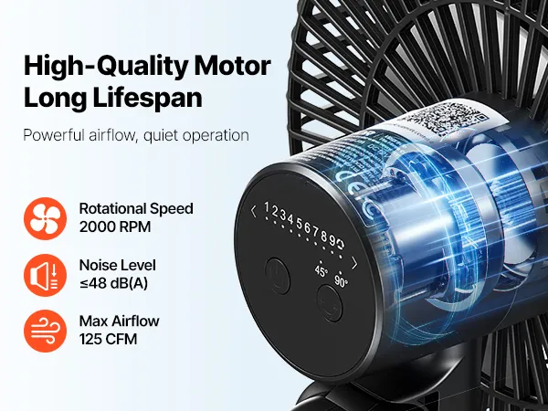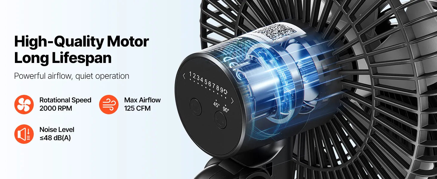 Innowacyjny, kwadratowy zacisk wentylatora umożliwia stabilne i wszechstronne mocowanie do masztów o różnych rozmiarach. Można go bezpiecznie przymocować do stelaży propagacyjnych i ram namiotów, zapewniając niezawodny przepływ powietrza.