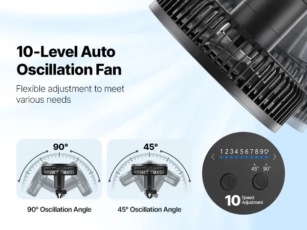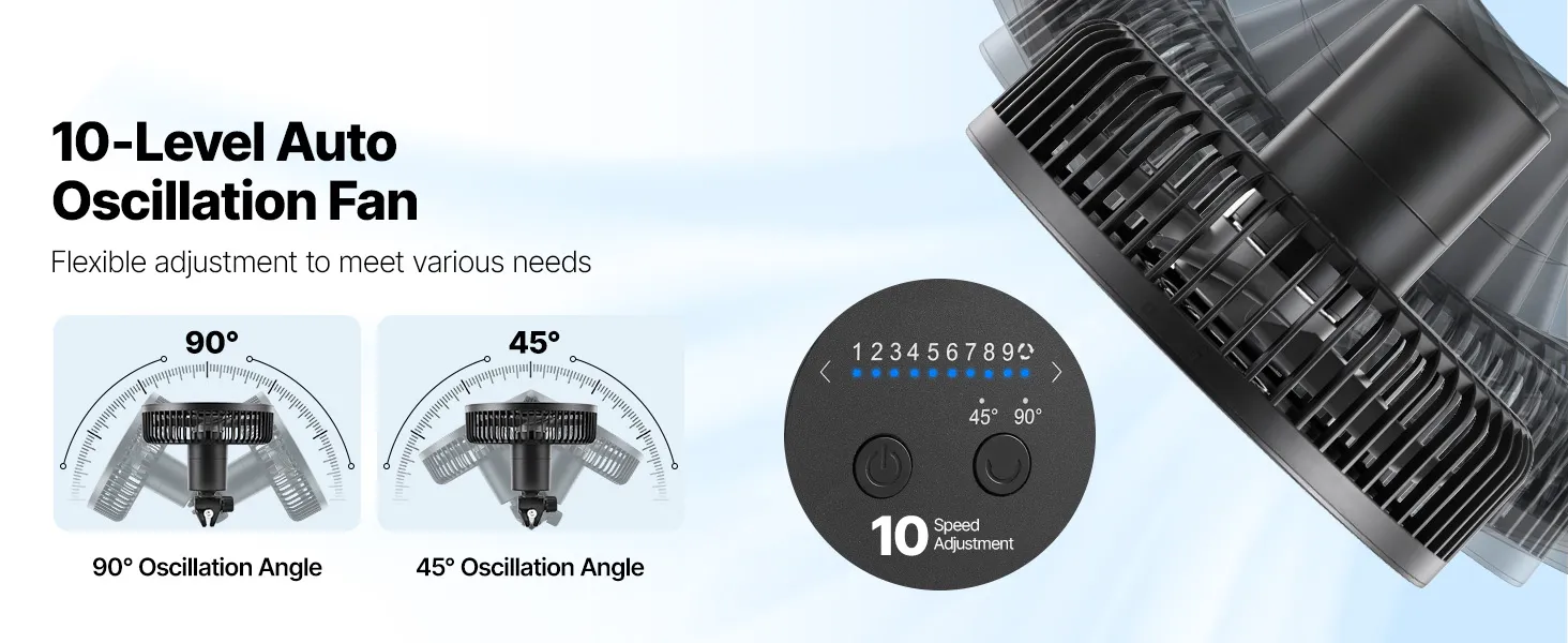 Obsługuje oscylację 45° i 90°, zapewniając szeroką i ciągłą cyrkulację powietrza. Posiada 9 stałych ustawień prędkości i 1 tryb cyrkulacji z automatycznym przełączaniem między 1,3 a 3,9 m/s, symulując naturalne wzorce wiatru dla zdrowszego wzrostu roślin.