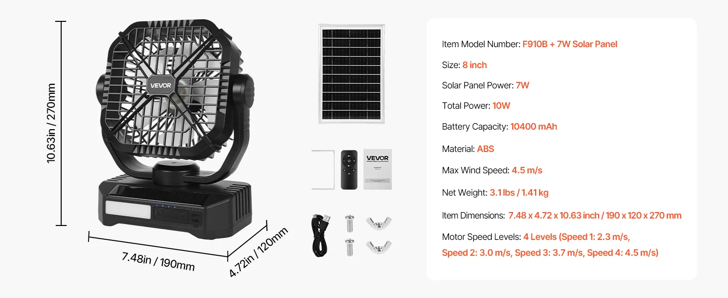 VEVOR 10400 mAh wentylator solarny, wentylator kempingowy z panelem słonecznym i latarką LED, 7 W, 20 cm, przenośny akumulator, 4 prędkości i cicha praca, idealny na pikniki, grille, wędkowanie i podróże