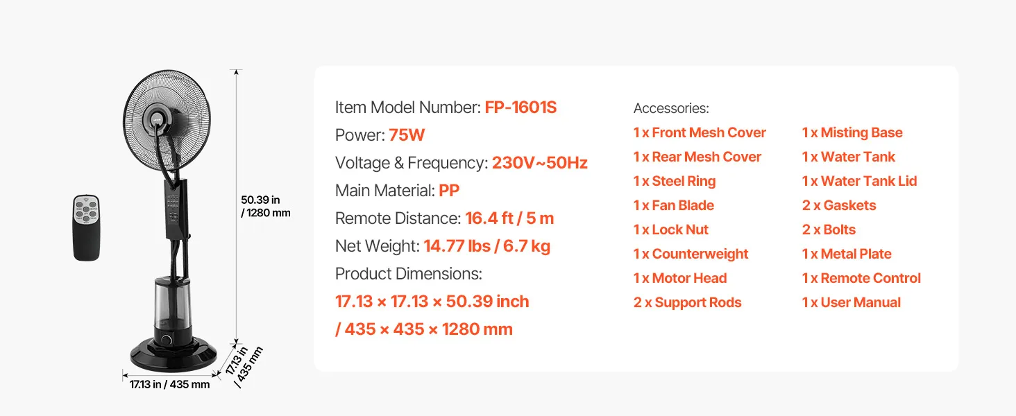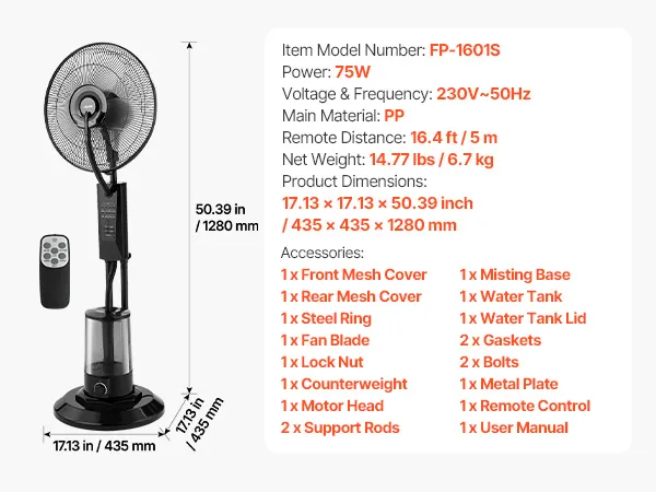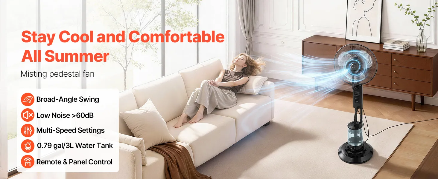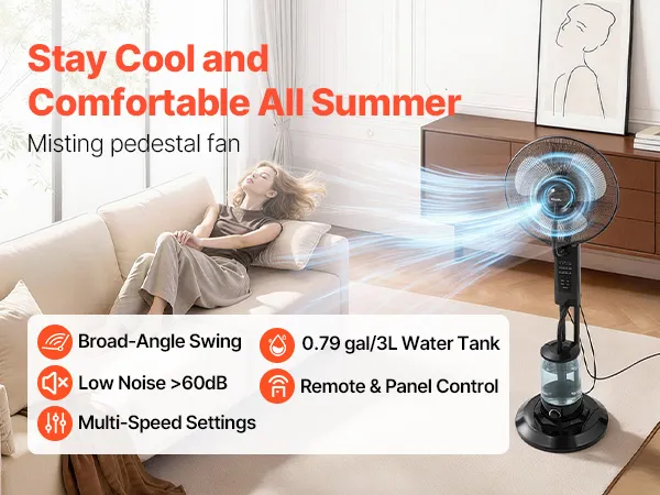 Wentylator stojący VEVOR z funkcją mgiełki, wentylator 75 W ze zbiornikiem na wodę o pojemności 3 l, 3 prędkości wiatru, timer i pilot zdalnego sterowania, nawilżacz powietrza z systemem natryskowym do użytku wewnątrz i na zewnątrz (garaż, patio, salon), 3 tryby pracy
