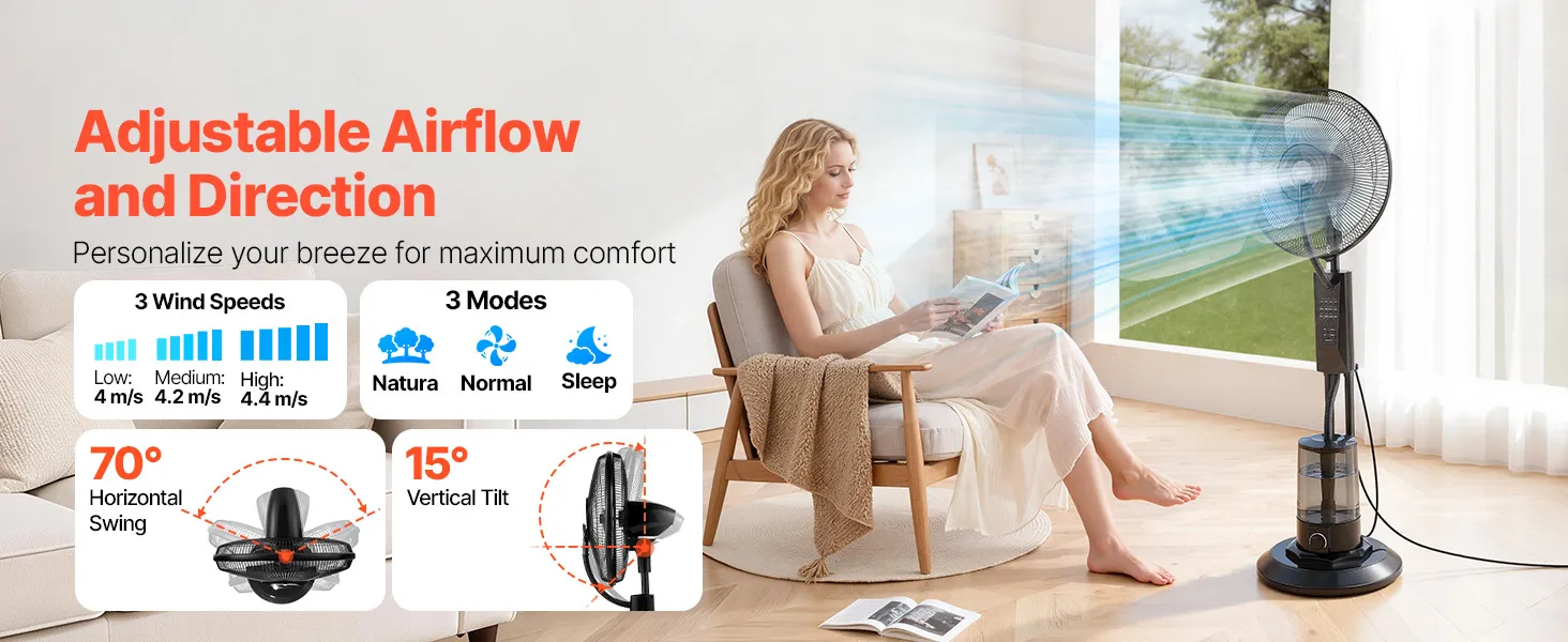 Szeroki kąt nawiewu: Dzięki zakresowi obrotu w poziomie 70° i kątowi nachylenia w pionie ponad 15°, ten wentylator stojący z funkcją mgiełki równomiernie rozprowadza chłodne powietrze po całym pomieszczeniu. Dzięki szerokiemu kątowi nawiewu nadaje się zarówno do dużych pomieszczeń, jak i wąskich narożników, zapewniając długotrwały komfort, niezależnie od miejsca, w którym go umieścisz.