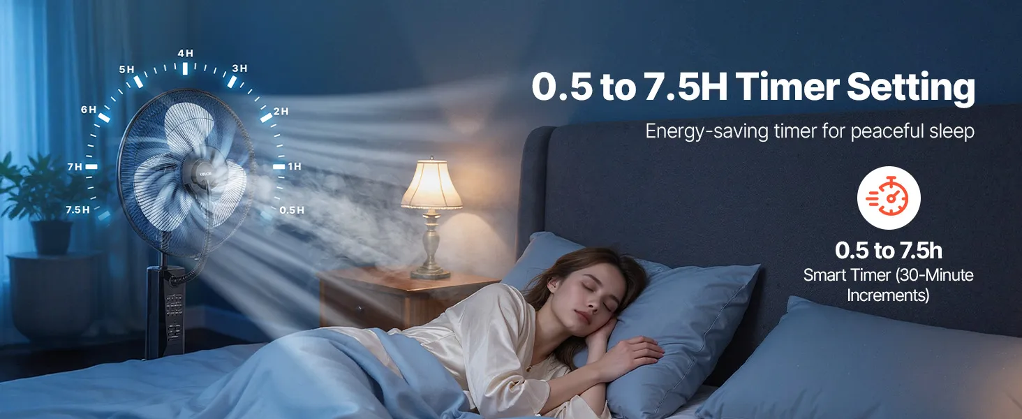 Ten zewnętrzny wentylator z funkcją mgiełki jest wyposażony w timer (0,5–7,5 godziny), dzięki czemu możesz ustawić chłodzenie na krótką przerwę lub na spokojny sen. Wystarczy wybrać żądany czas, aby uniknąć niepotrzebnego włączania.