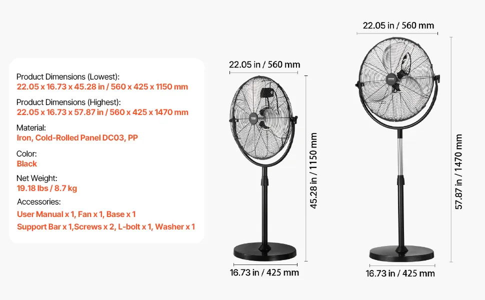 VEVOR Przemysłowy wentylator stojący, wentylator 560 mm z regulowaną wysokością 115-147 cm, wentylator podłogowy z 3 regulowanymi prędkościami, wentylator do salonu, domu, biura, czarny