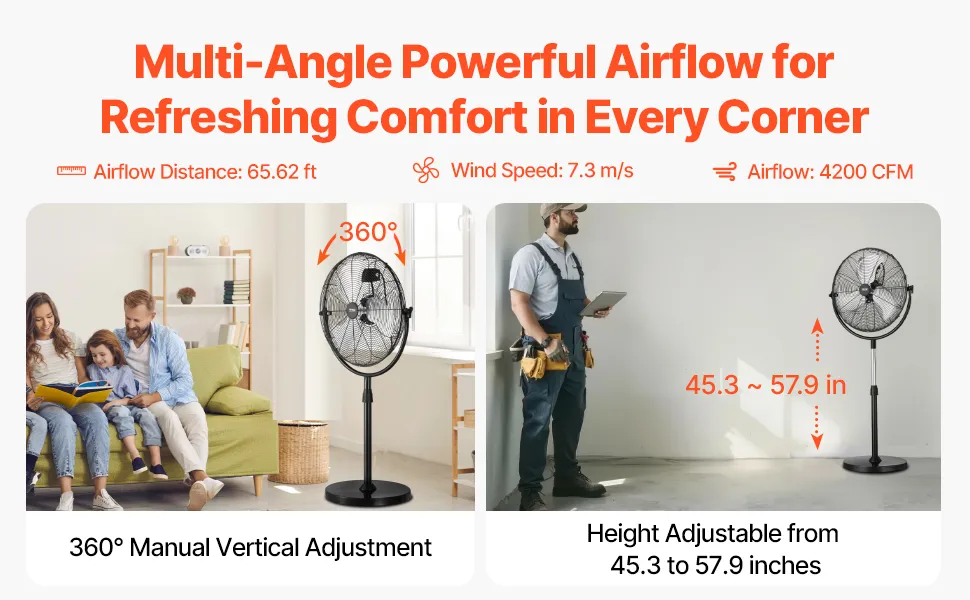 Regulacja wysokości: Nasz wentylator sypialniany oferuje zakres regulacji wysokości od 45,3 do 57,9 cala (od 115 do 147 cm), co pozwala dostosować wysokość wentylatora do aktywności wykonywanych w pomieszczeniu lub potrzeb w miejscu pracy.