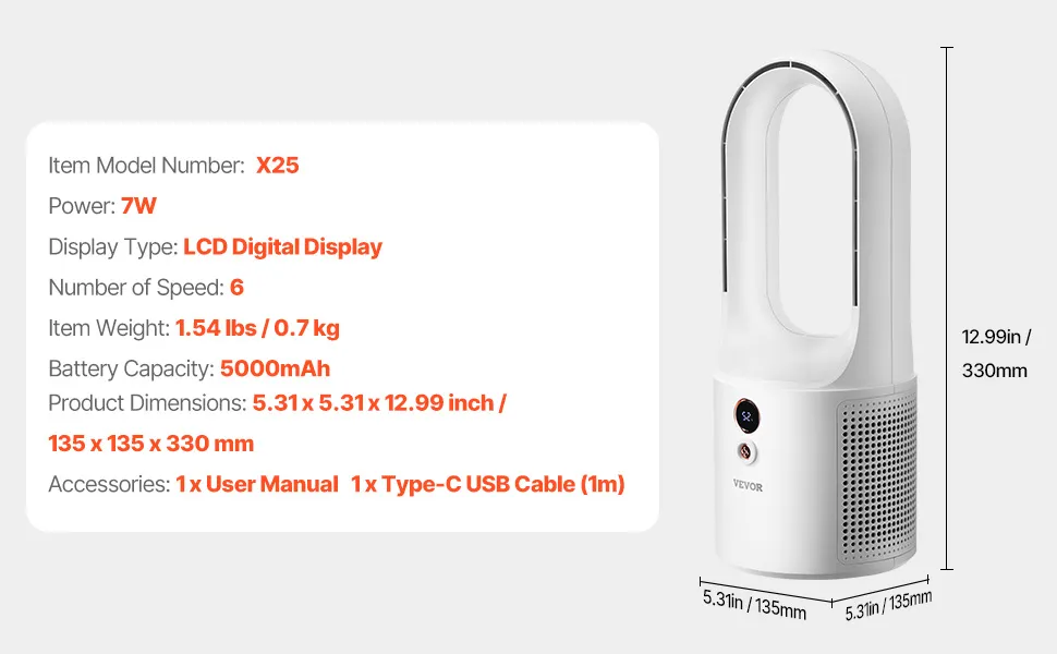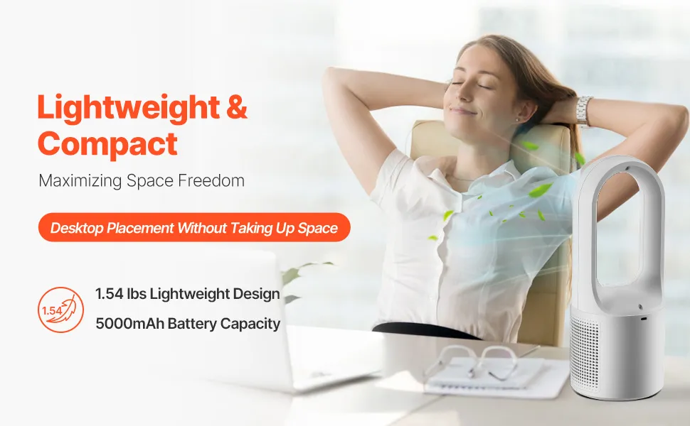 Lekki i kompaktowy: Dzięki ultralekkiej konstrukcji, ważącej zaledwie 0,7 kg i wbudowanemu akumulatorowi o pojemności 5000 mAh, ten przenośny wentylator bezłopatkowy jest łatwy w przenoszeniu i zmieści się w każdym kącie, nie zajmując dużo miejsca. Idealny do elastycznych układów i stałego chłodzenia wszędzie tam, gdzie go potrzebujesz.