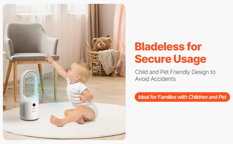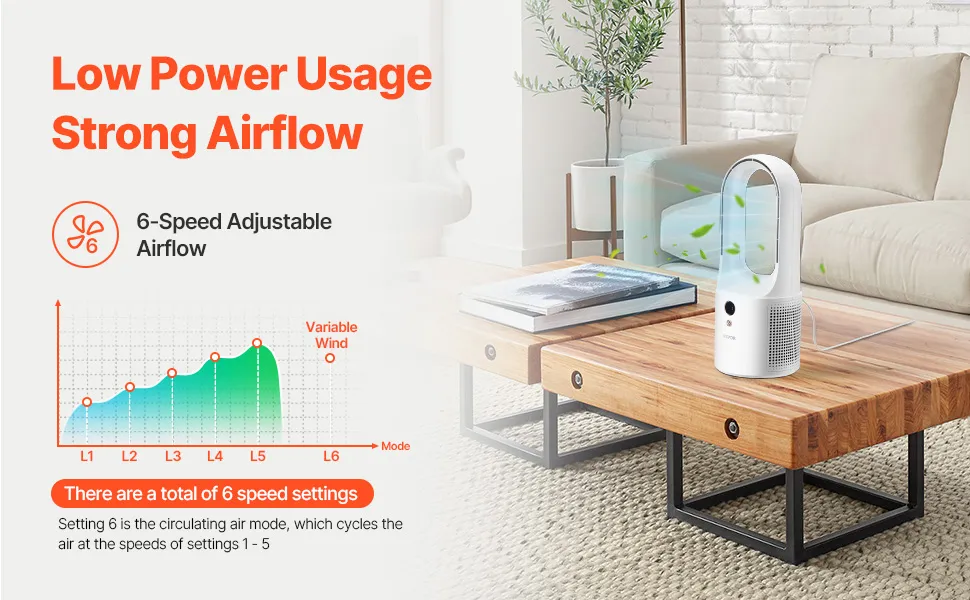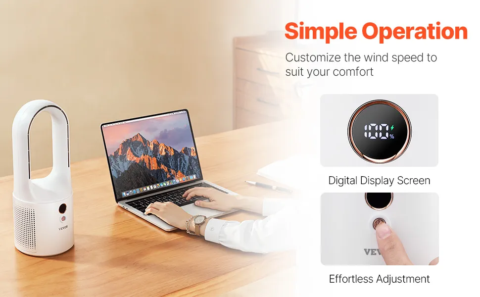 Łatwy w użyciu: Ten cichy, bezłopatkowy wentylator biurowy z przyciskami sterującymi posiada wyświetlacz LCD i czułe przyciski dotykowe, umożliwiając płynną regulację 6 prędkości nawiewu. Od delikatnego powiewu po silny strumień powietrza, dostosowuje się do Twoich potrzeb chłodzenia, dzięki czemu każda chwila staje się orzeźwiająco wszechstronna.