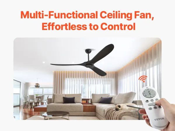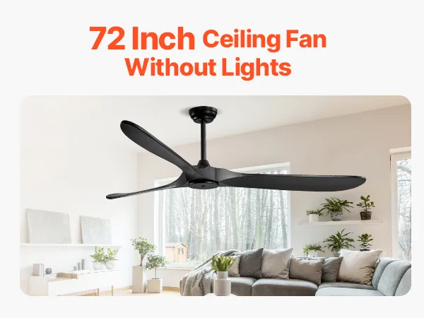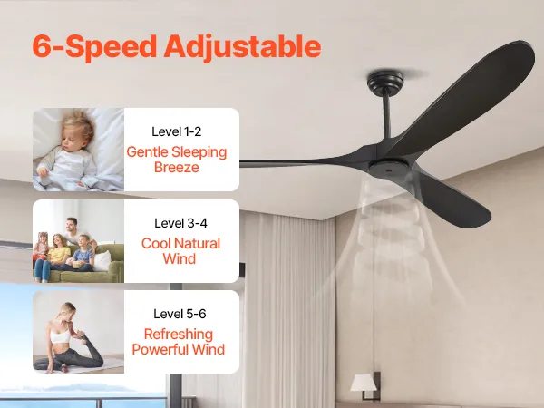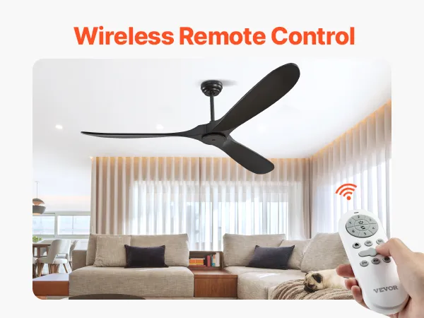 Wentylator sufitowy VEVOR 180 cm bez oświetlenia, 6-biegowy pilot, 3 drewniane łopatki, odwracalny silnik prądu stałego, wentylator zewnętrzny do sypialni, salonu, patio, do użytku wewnątrz i na zewnątrz, czarny