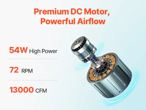 Cichy silnik prądu stałego: Ten wentylator sufitowy do sypialni jest wyposażony w wysoce wydajny silnik prądu stałego o mocy 54 W, przepływ powietrza do 13 000 CFM i pracuje przy niskim poziomie hałasu ≤ 42 dB, dzięki czemu możesz cieszyć się cichym i przyjemnym powiewem wiatru. Nawet późno w nocy niski poziom hałasu nie zakłóci Twojego snu, pozwalając cieszyć się spokojną i chłodną letnią nocą.