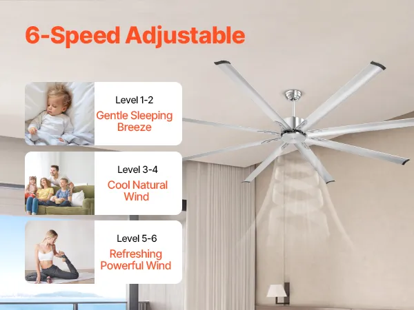 Wentylator sufitowy VEVOR 244 cm bez oświetlenia, 6-biegowy pilot, 8 aluminiowych łopatek, silnik prądu stałego, wentylator do sypialni, salonu, patio, do użytku wewnątrz i na zewnątrz, szczotkowany nikiel