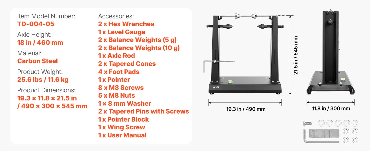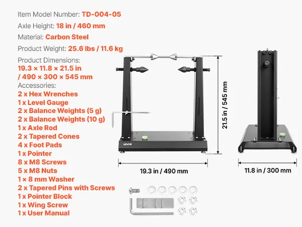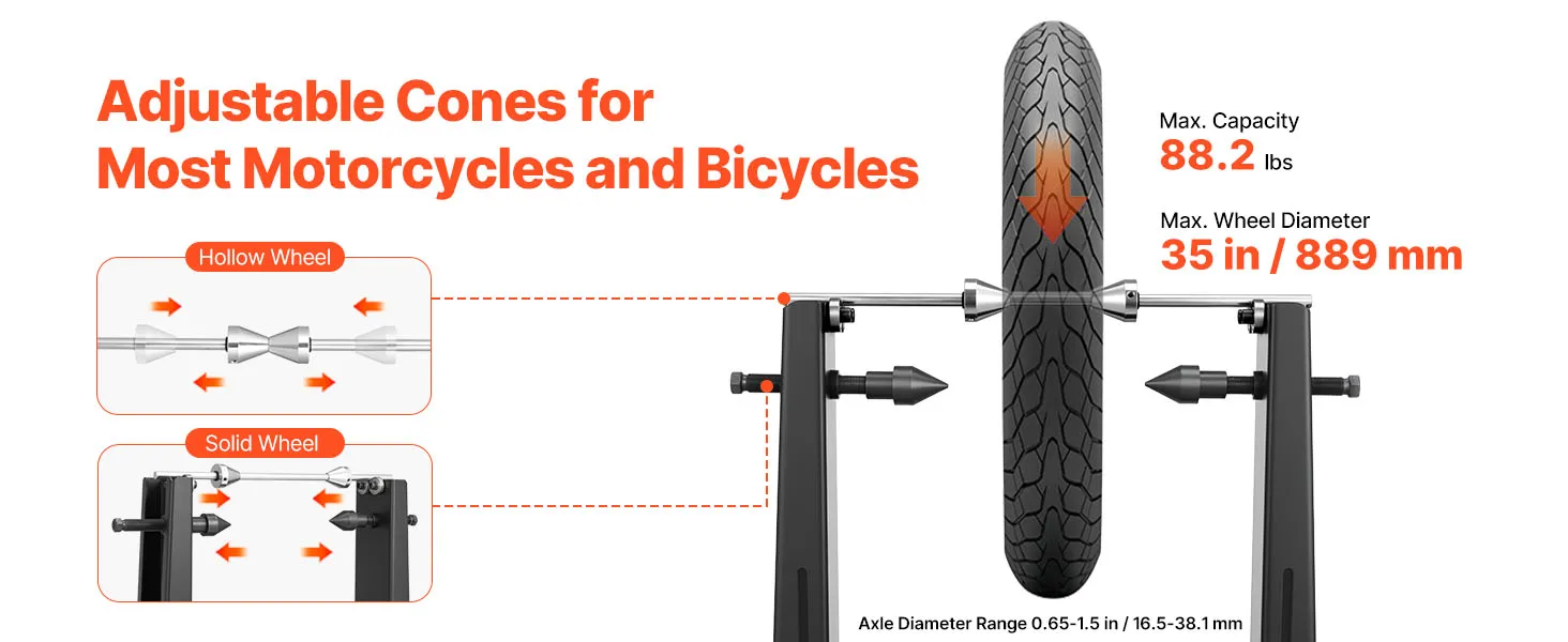 Wysoka kompatybilność: Nasza wyważarka do kół motocyklowych i rowerowych współpracuje z większością kół motocyklowych i rowerowych, w tym z kołami pełnymi i pustymi. Nadaje się do osi o średnicy od 0,65 do 1,5 cala, kół o średnicy do 35 cali (88,9 cm) i obciążenia do 88,2 funta (40 kg).