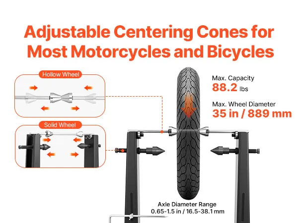 Stojak do wyważania kół motocyklowych VEVOR, wyważarka do opon, udźwig 40 kg, stojak centrujący do wyważarki do opon z regulowanymi stożkami centrującymi i wskaźnikiem centrującym, pomoc w montażu opon do koła φ 889 mm