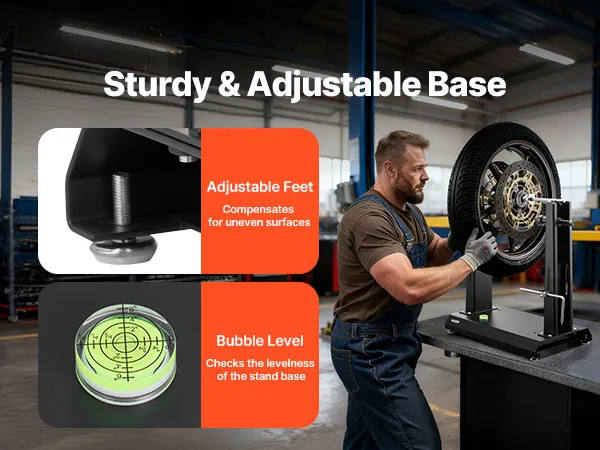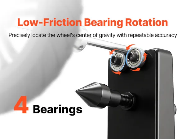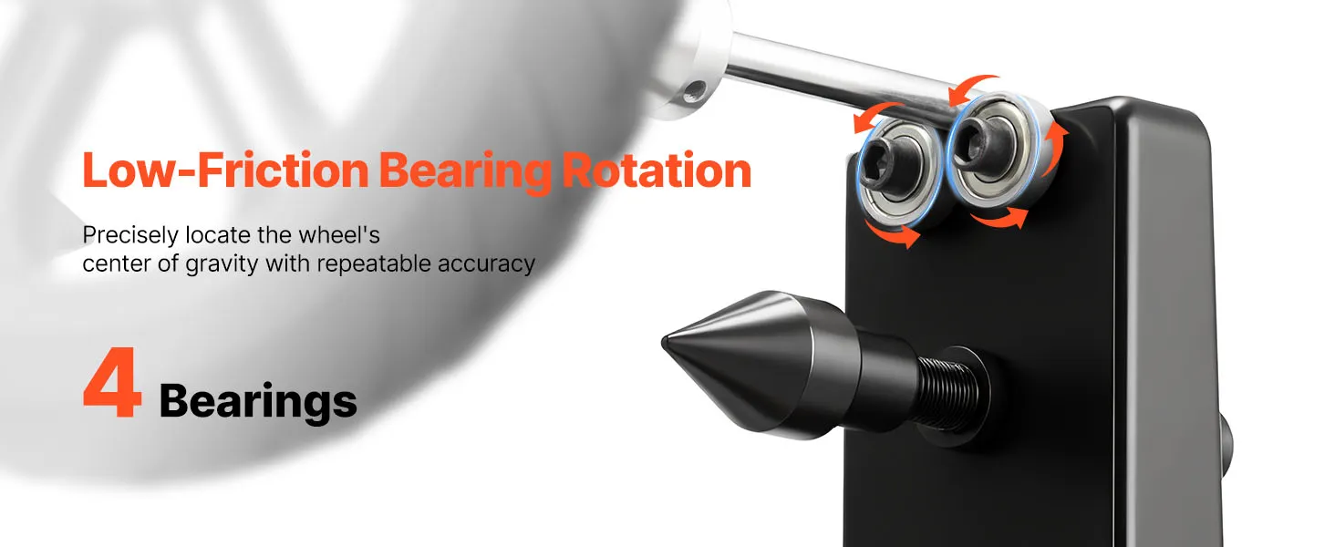 Łatwy w użyciu: Ten stojak do wyważania opon pozwala na zamocowanie koła, obrócenie go i automatyczne zatrzymanie – najniższy punkt wskazuje punkt największego obciążenia. Zaznacz ten punkt, obróć koło do góry i zamocuj obciążniki. Po wyważeniu koło pozostaje stabilne w każdej pozycji.