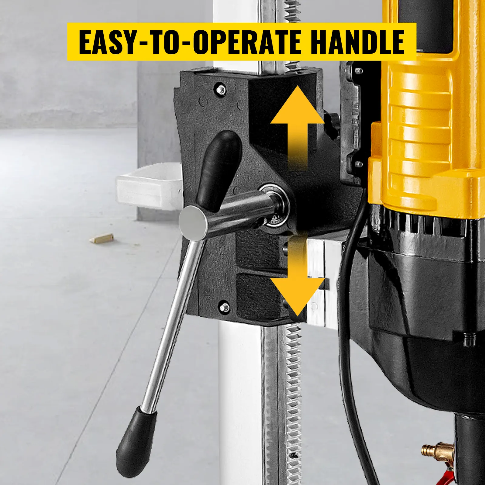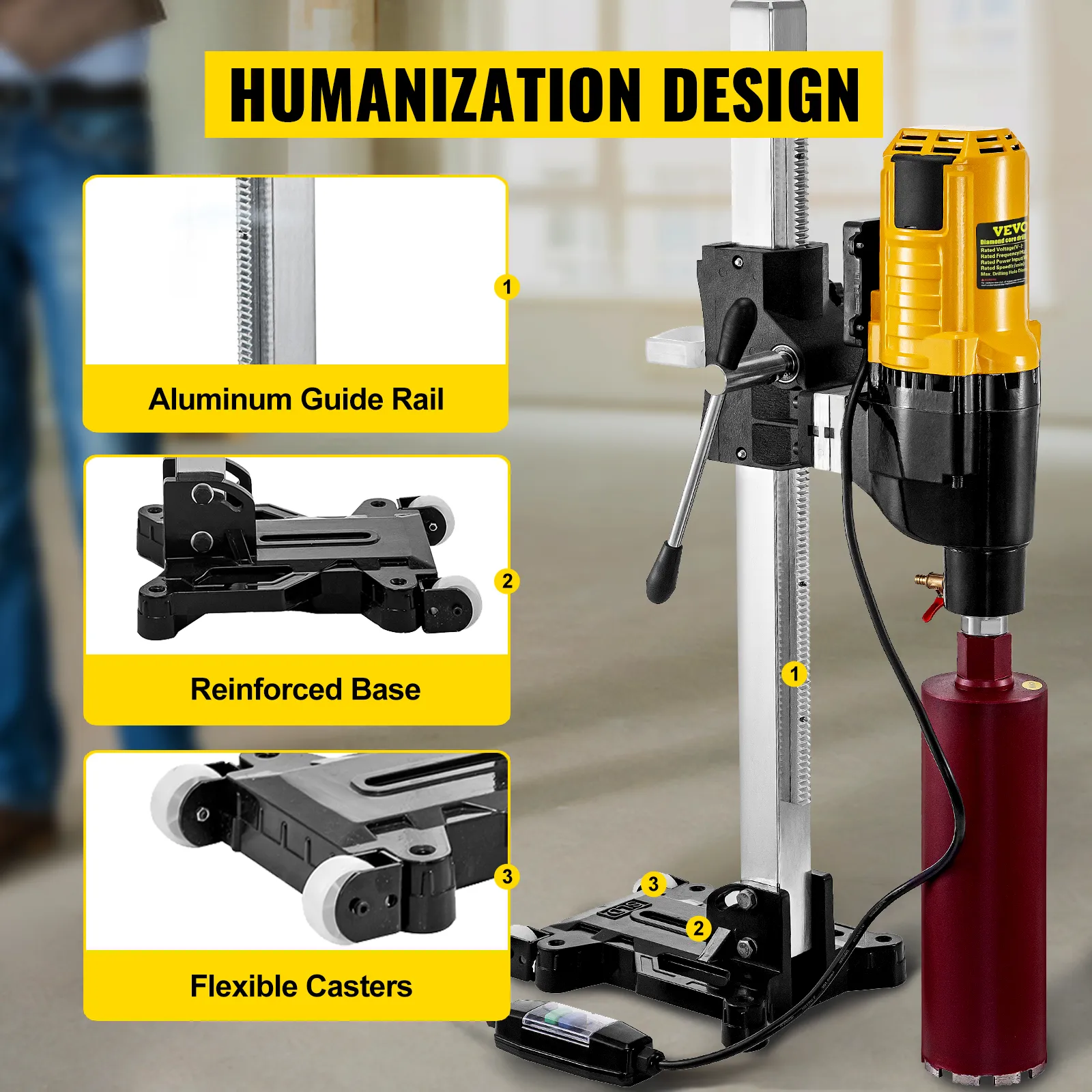 Ergonomiczny uchwyt i stabilna podstawa: Posiada ergonomiczny uchwyt i dużą podstawę do łatwego wiercenia lub ukośnych otworów. Aluminiowa szyna prowadząca sprawia, że ruch statywu jest płynniejszy i dokładniejszy. Dwa koła ułatwiające transport.