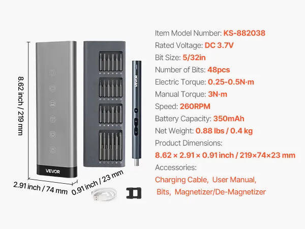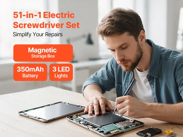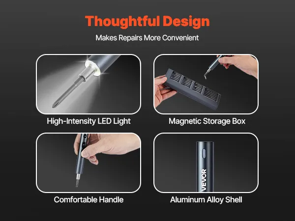 VEVOR Elektryczny precyzyjny śrubokręt (48 magnetycznych końcówek) Miniaturowy elektryczny śrubokręt z magnetycznym schowkiem, oświetleniem LED i funkcją ładowania typu C, do naprawy telefonów komórkowych i laptopów