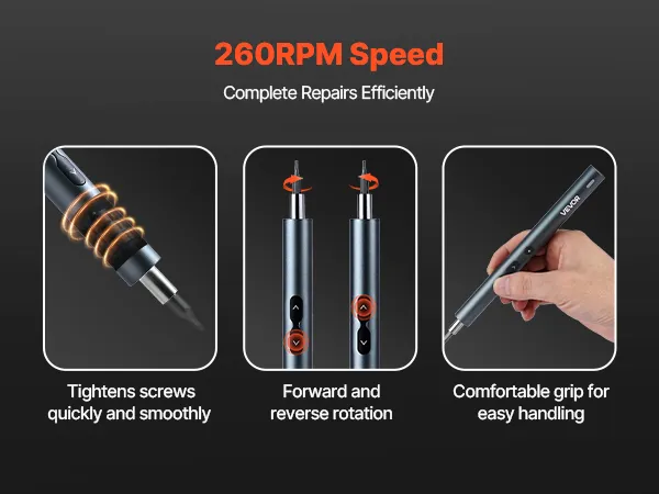 Dzięki prędkości 260 obr./min szybko wykonasz swoją pracę, niezależnie od tego, czy montujesz meble, czy naprawiasz małe urządzenia. Ergonomiczny uchwyt miniwkrętarki elektrycznej wygodnie leży w dłoni i zapewnia płynne, bezwysiłkowe wkręcanie, nawet podczas długotrwałego użytkowania.