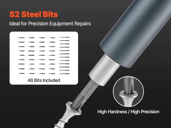 Zestaw bitów w magnetycznym etui: Miniaturowy wkrętak elektryczny zawiera 48 precyzyjnych bitów do telefonów, tabletów, aparatów i innych urządzeń. Magnetyczne etui z wysuwaną konstrukcją ułatwia wymianę bitów i utrzymuje porządek.