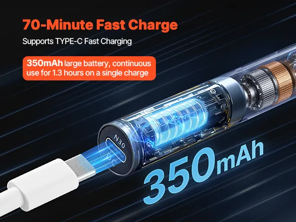 Wytrzymała bateria i szybkie ładowanie: Bateria o pojemności 350 mAh wystarcza na 1,3 godziny pracy na jednym ładowaniu. Dzięki szybkiemu ładowaniu przez USB typu C, pełna moc jest przywracana w zaledwie 70 minut, dzięki czemu Twój mini zestaw wkrętaków elektrycznych jest gotowy do użycia w każdej chwili.