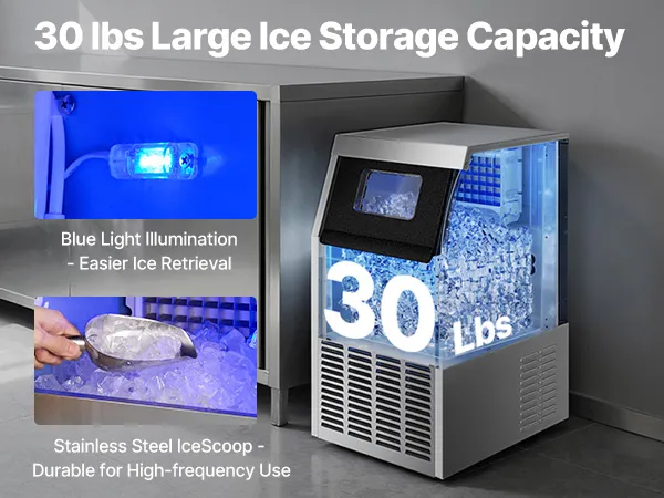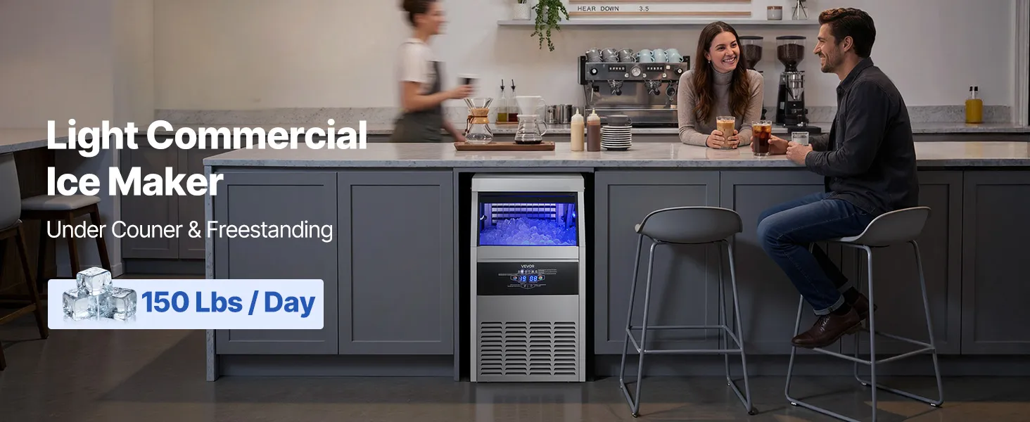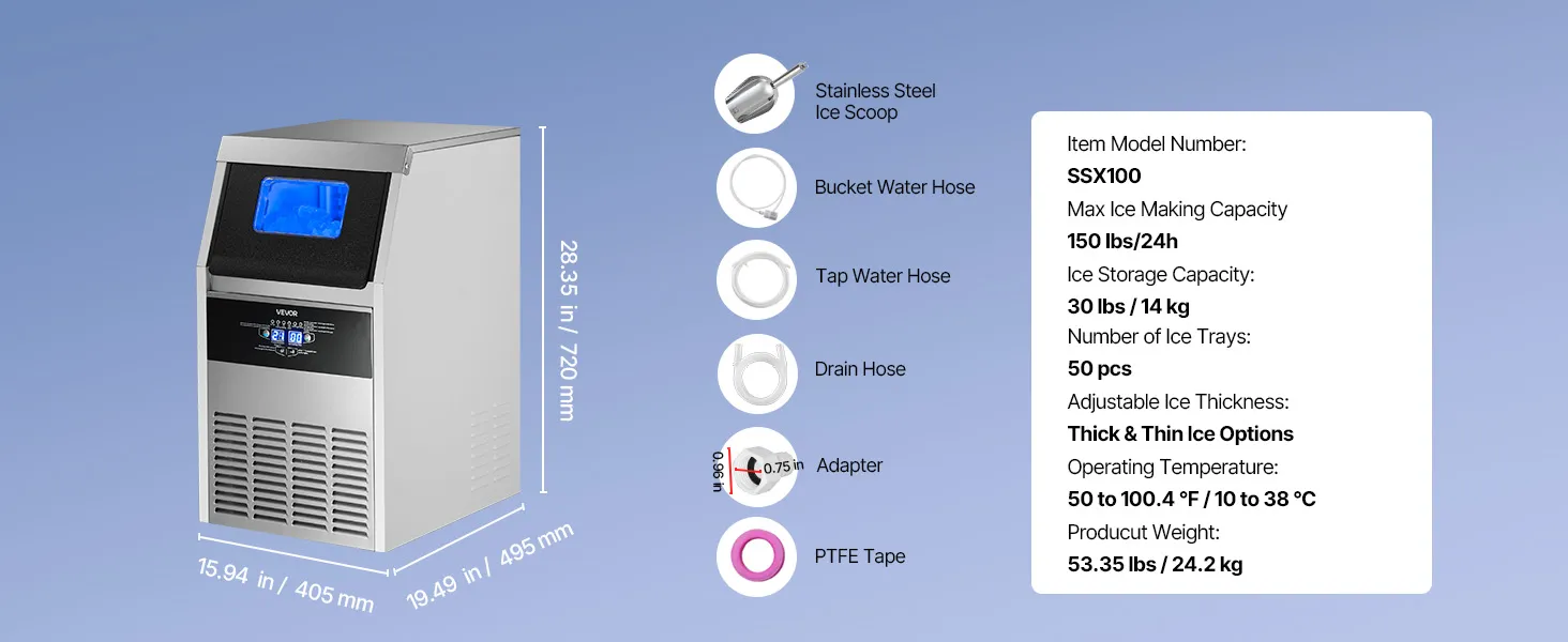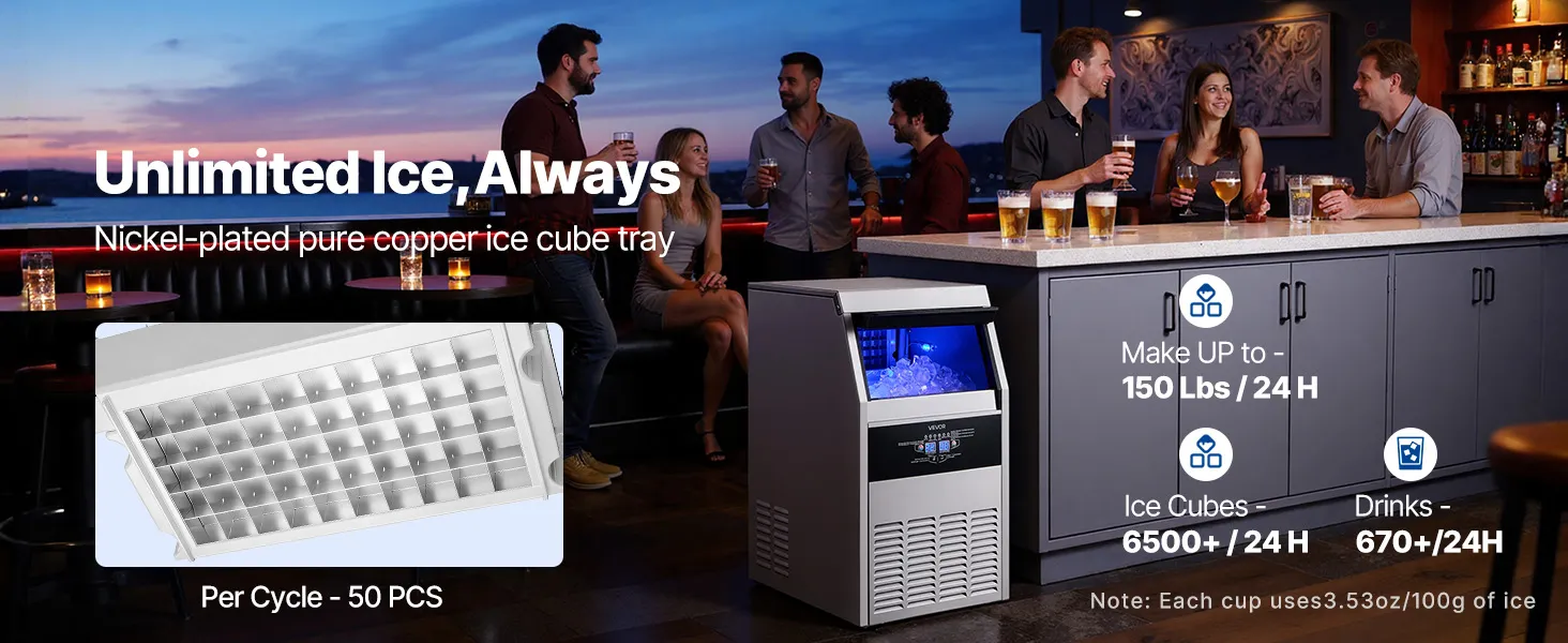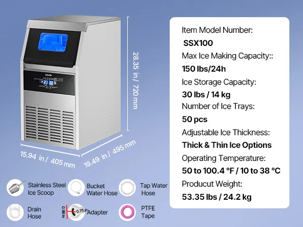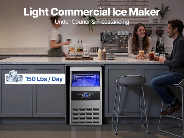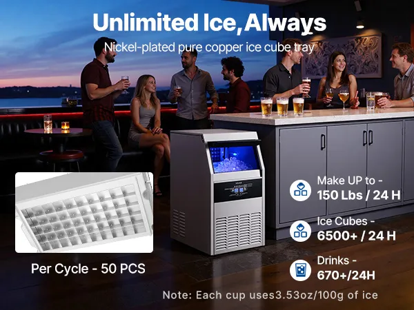 Wysoka wydajność i duża pojemność: Ta komercyjna kostkarka do lodu produkuje do 68 kg (150 funtów) lodu dziennie i wytwarza 50 kostek lodu w ciągu 8 do 10 minut. Dzięki 14-kilogramowemu (30 funtów) zbiornikowi na lód, kostkarka nadaje się do przygotowania ponad 670 napojów i zapewnia płynną pracę.
