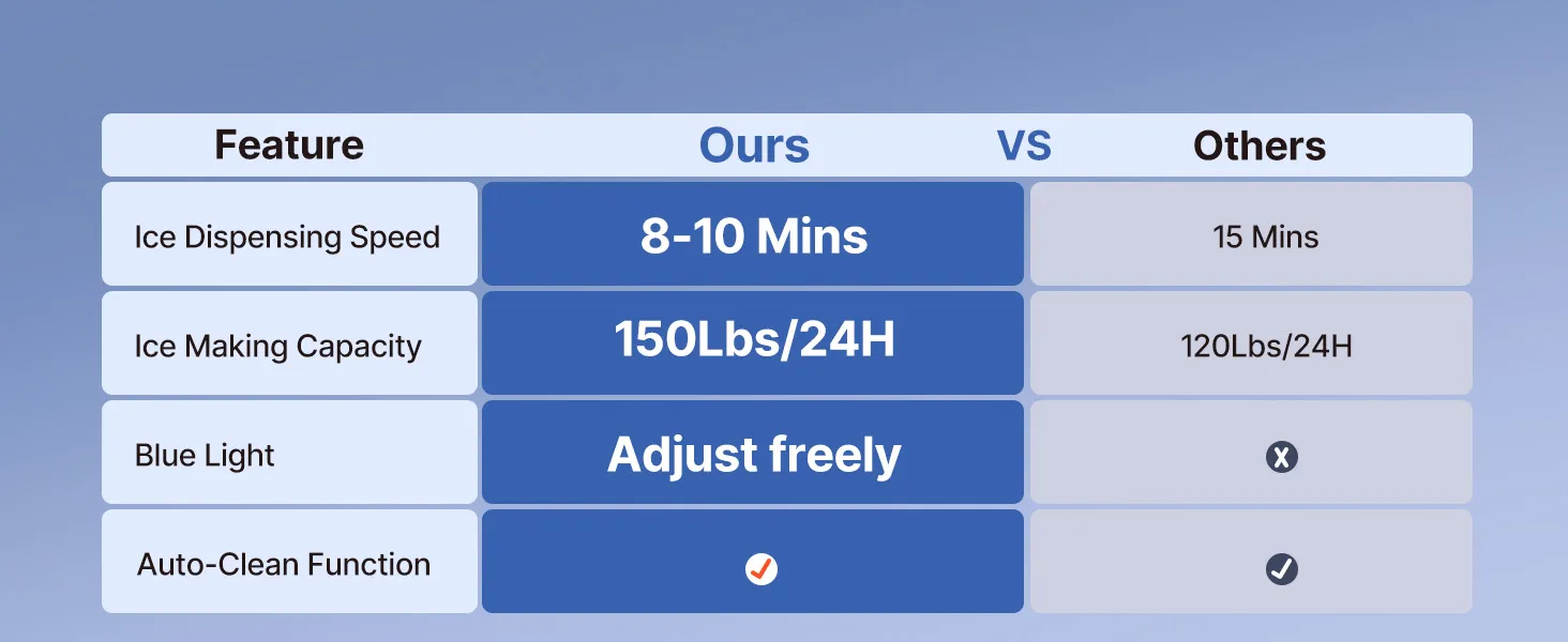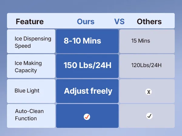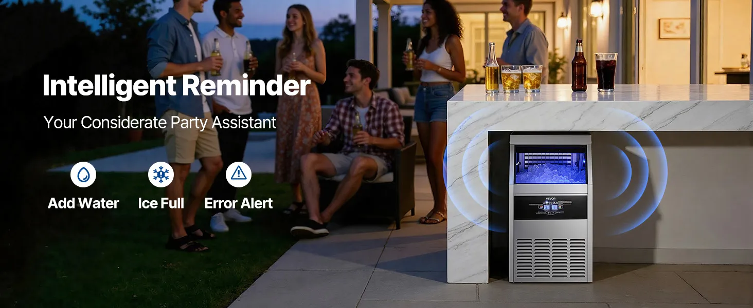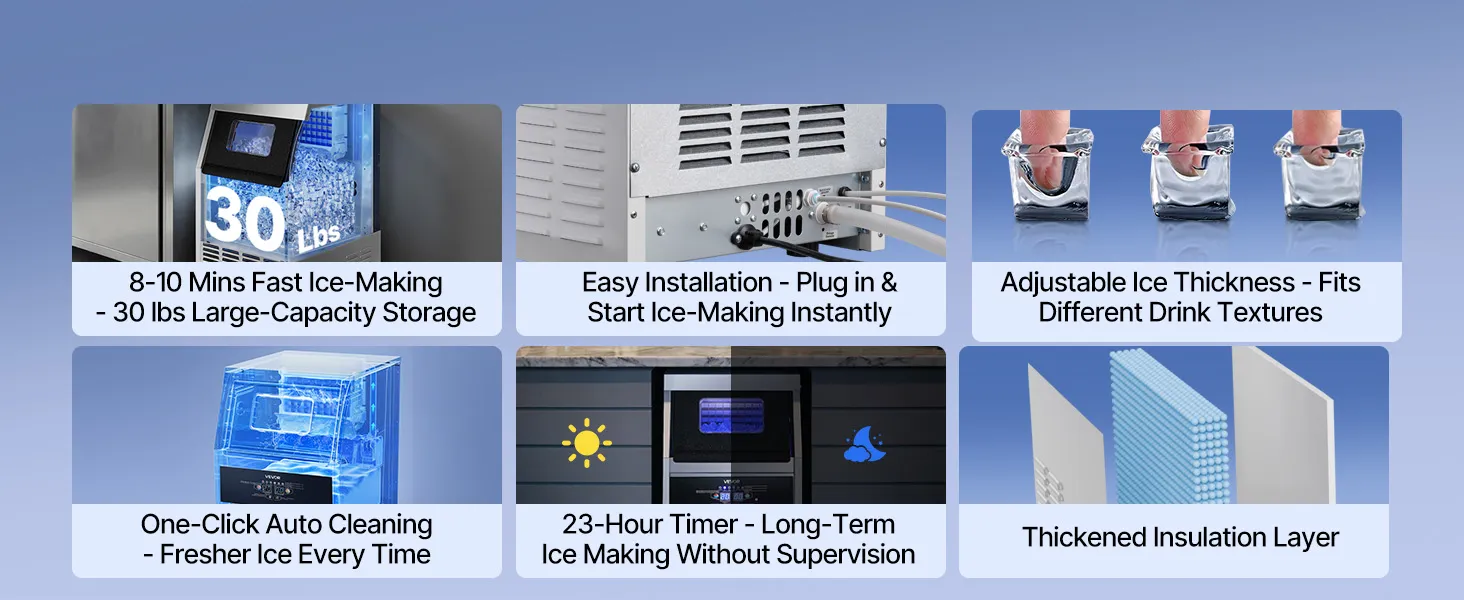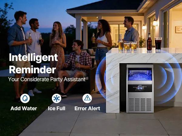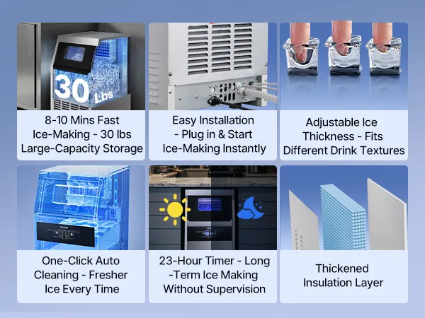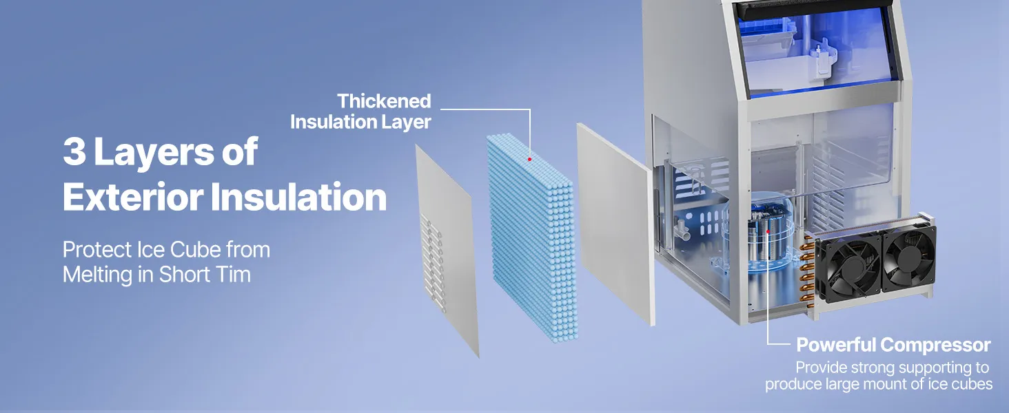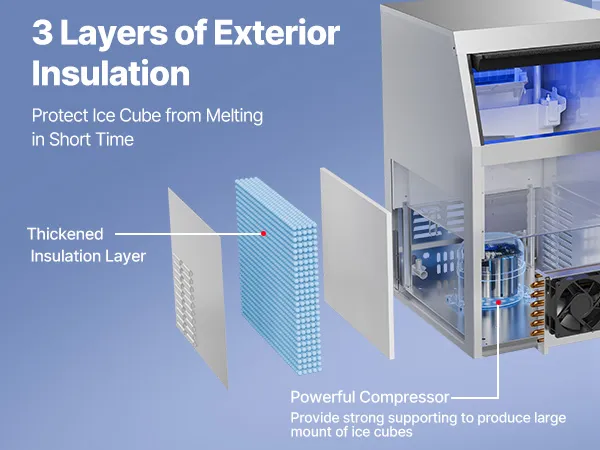 Doskonała izolacja: Urządzenie produkuje krystalicznie czyste kostki lodu o wymiarach 20 mm (0,8 cala). Posiada certyfikat ETL; zintegrowana izolacja z pianki cyklopentanowej w połączeniu z obudową ze stali nierdzewnej skutecznie chroni przed ciepłem zewnętrznym. Nawet po wyłączeniu urządzenie utrzymuje lód w stanie zamrożonym przez 6–8 godzin.