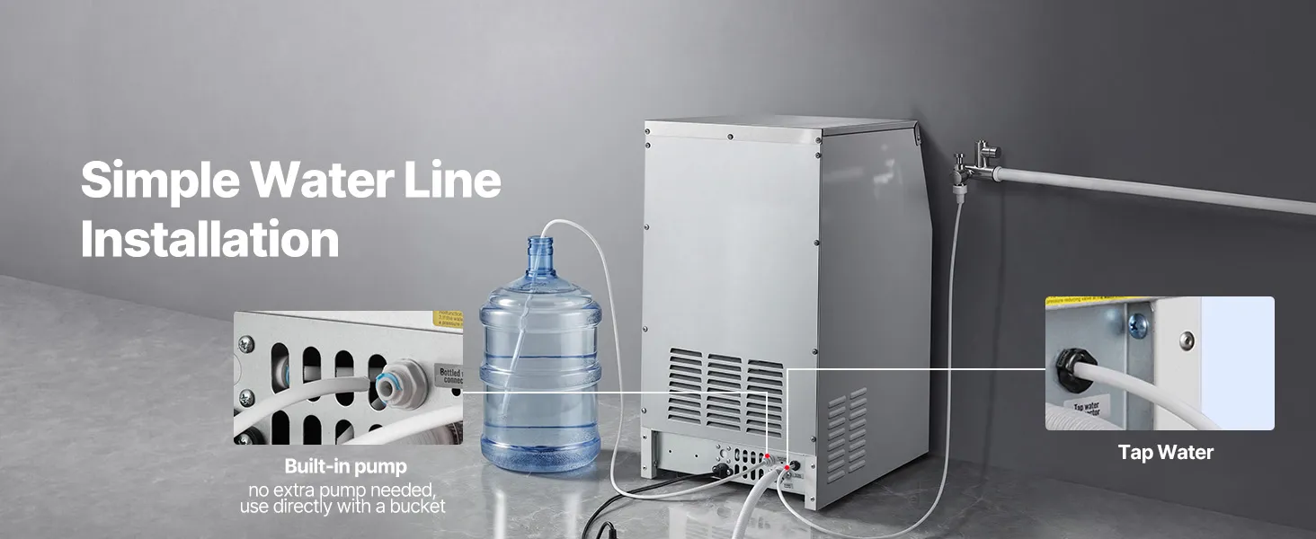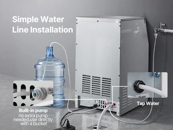 Podwójny system dopływu wody dla maksymalnej elastyczności: Dwie opcje: bezpośrednie podłączenie wody lub użycie wody butelkowanej. W zestawie znajduje się wymagany zestaw montażowy dopływu i odpływu, który obsługuje automatyczne napełnianie, opróżnianie i aktywację cyklu zamrażania. Przed pierwszym użyciem należy pozostawić urządzenie w pozycji pionowej na 24 godziny.