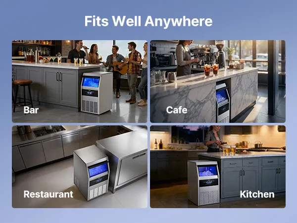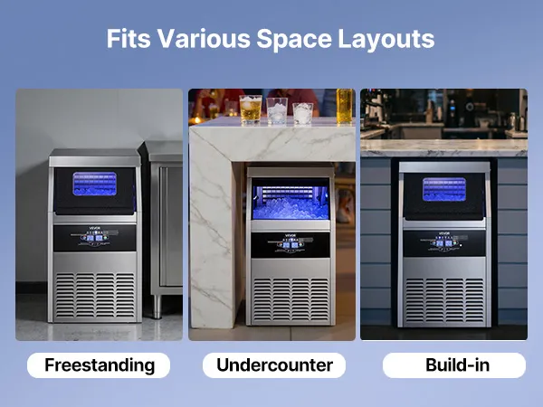 Wszechstronne możliwości instalacji: Ta kostkarka do lodu może być używana pod blatem lub wolnostojąca – idealna do kuchni, barów, kawiarni, restauracji i sklepów detalicznych. Cztery regulowane nóżki zapewniają stabilność nawet na nierównych podłogach.