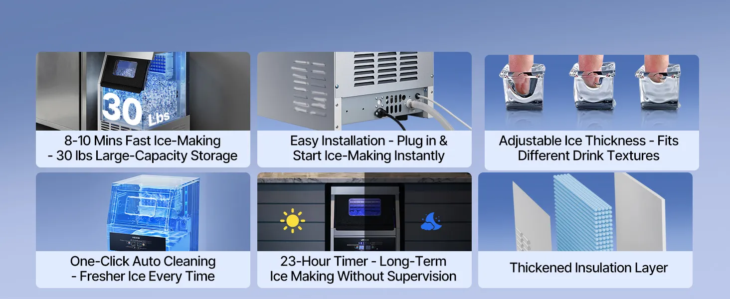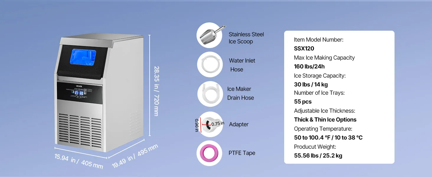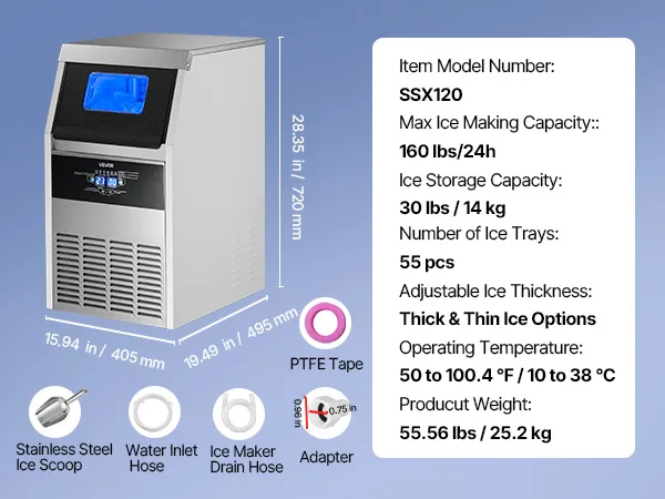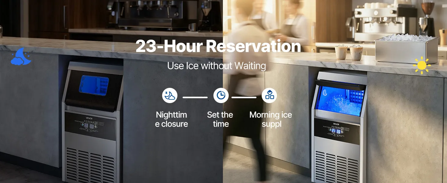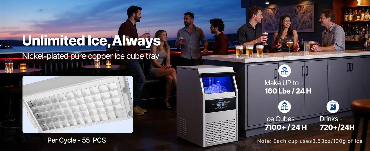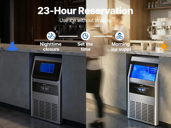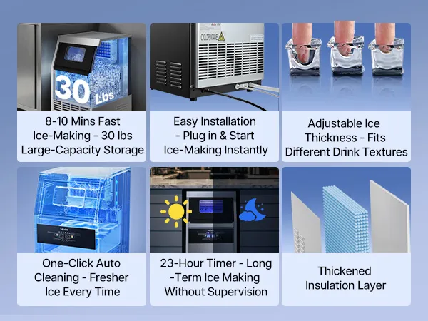 Wysoka wydajność i duża pojemność: Ta komercyjna kostkarka do lodu produkuje do 73 kg (160 funtów) lodu dziennie i wytwarza 55 kostek lodu w ciągu 8–10 minut. Dzięki 14-kilogramowemu (30 funtów) zbiornikowi na lód, urządzenie nadaje się do przygotowania ponad 720 napojów i zapewnia płynną pracę.
