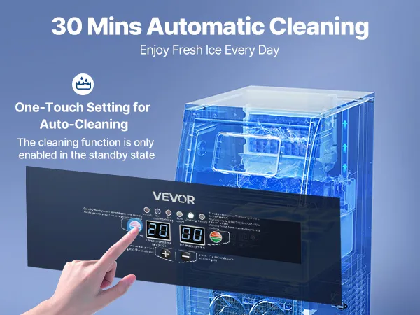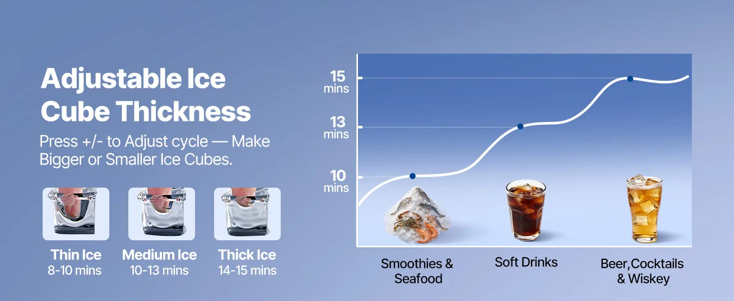 Regulowana grubość lodu: Urządzenie produkuje krystalicznie czyste kostki lodu o boku 20 mm (0,8 cala). Czas produkcji można regulować, aby dostosować grubość lodu – idealne do napojów, owoców morza, smoothie i koktajli. Odchylana pokrywa i solidna łyżka do lodu ze stali nierdzewnej ułatwiają codzienne wyjmowanie lodu.