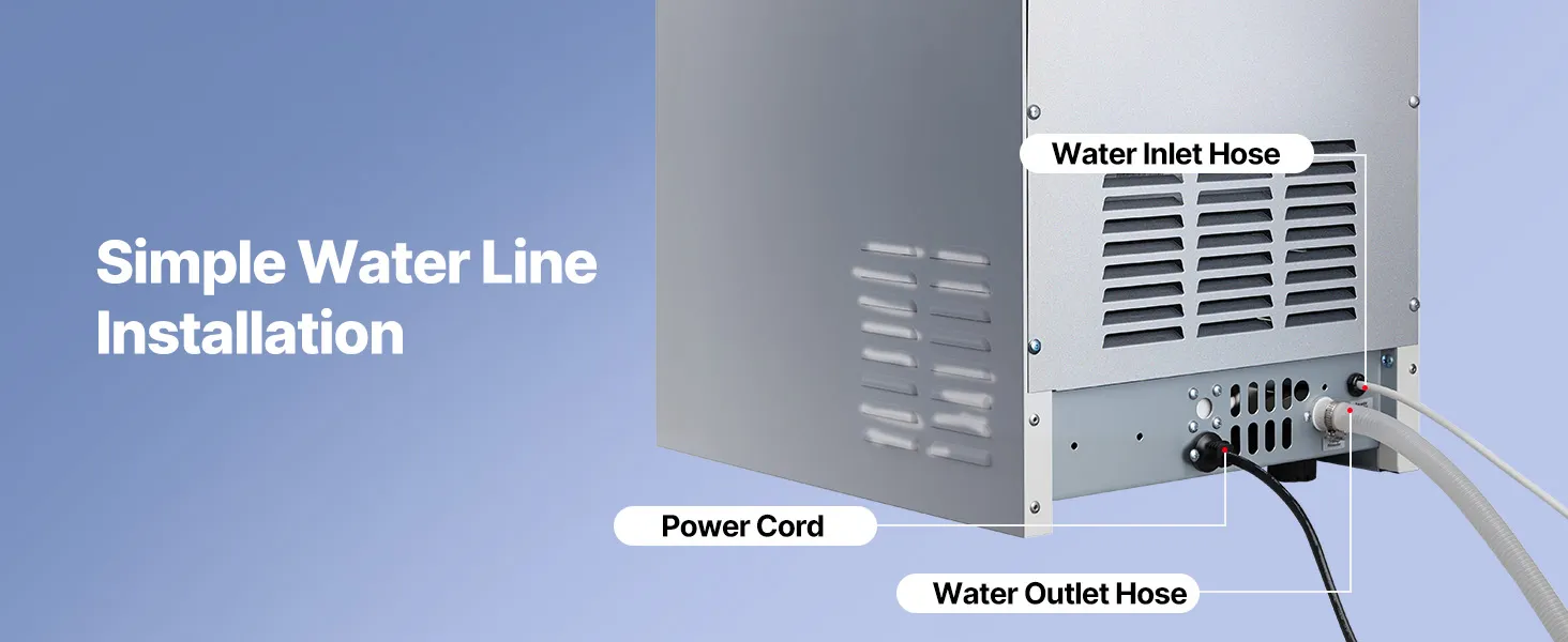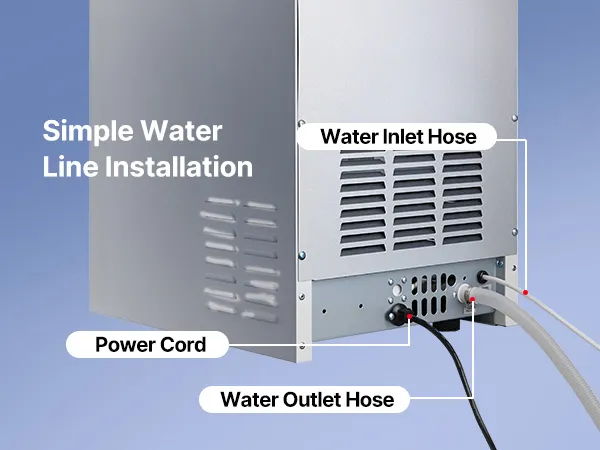 Inteligentny panel sterowania: Wyświetlacz pokazuje temperaturę otoczenia i oferuje regulację grubości lodu, funkcję timera, samoczyszczenie za naciśnięciem przycisku oraz ostrzeżenia o pełnym pojemniku, niskim poziomie wody lub usterkach. Dzięki dołączonym akcesoriom podłączenie węży wlotowego i wylotowego jest bezproblemowe. Przed pierwszym użyciem należy pozostawić urządzenie w pozycji pionowej na jeden dzień.