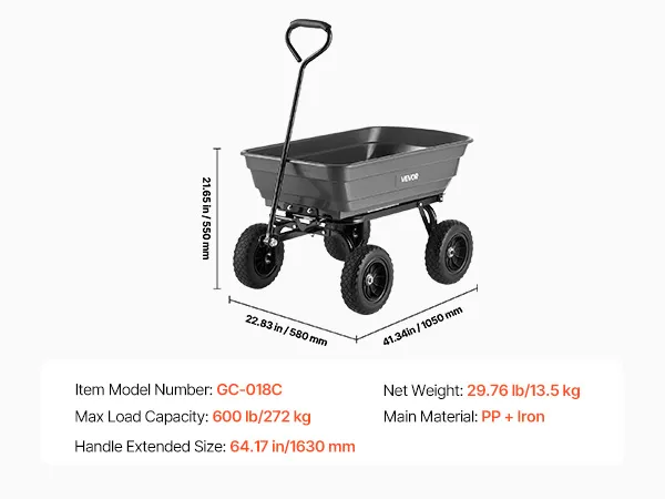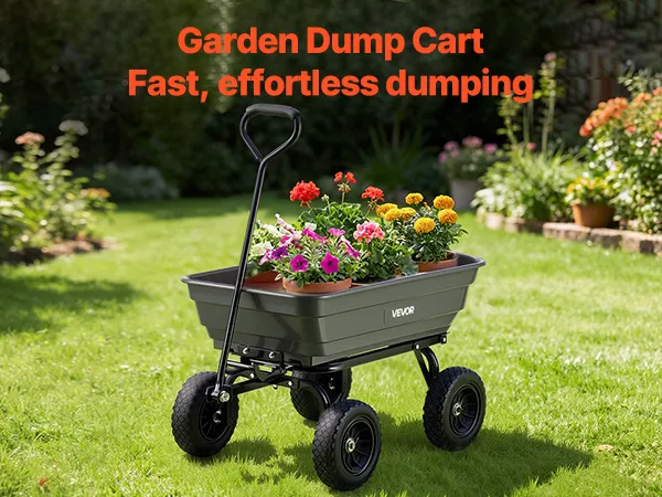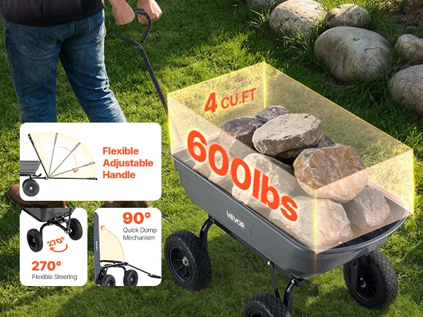 Nasza wywrotka ogrodowa o udźwigu 600 funtów / 272 kg wyposażona jest w system szybkiego wysypu, ułatwiający załadunek i rozładunek. Obrotowa rączka o 90° i koła o 180° zapewniają łatwość manewrowania, a lekką wannę można szybko wyczyścić, spłukując ją wężem. Idealna do roślin, gleby i upraw podczas prac w gospodarstwie rolnym lub w polu.