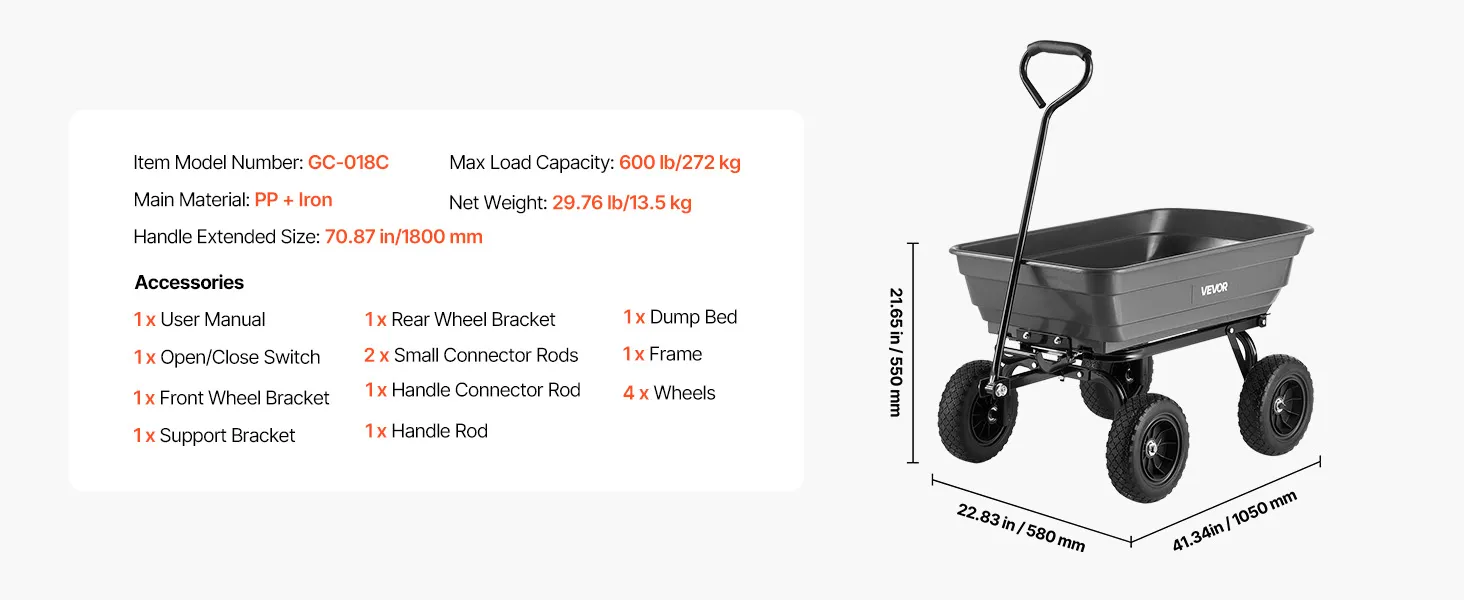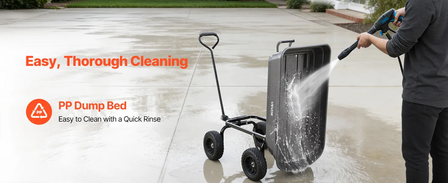 Łatwa obsługa dzięki obudowie z polipropylenu: Ten wózek ogrodowy VEVOR jest lekki i zwrotny, oferując płynniejsze prowadzenie i większą trwałość na zewnątrz w porównaniu z modelami metalowymi. Ziemię, trawę i nawóz można łatwo spłukać, co sprawia, że praca w ogrodzie jest łatwiejsza i bardziej relaksująca.
