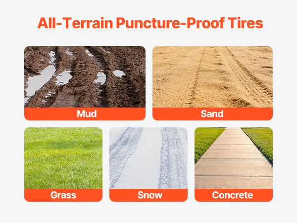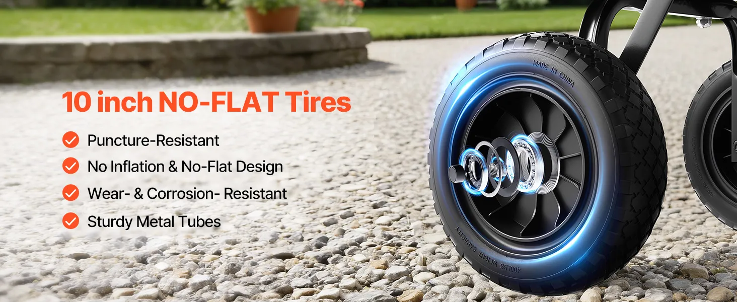 Możliwości terenowe: Wyposażony w odporne na przebicie koła poliuretanowe o średnicy 10 cali/254 mm, ten wózek ogrodowy bez trudu radzi sobie z trawą, błotem i żwirem. Platforma ładunkowa z polipropylenu (PP) i rama odporna na rdzę są wytrzymałe nawet przy częstym użytkowaniu na zewnątrz, zapewniając niezawodne przemieszczanie się podczas prac ogrodowych lub polowych.