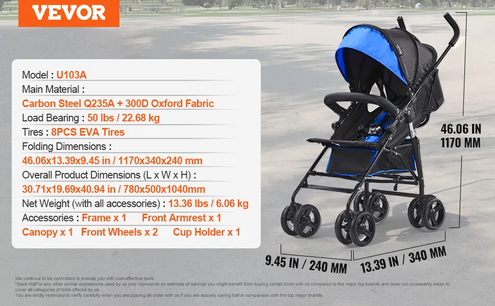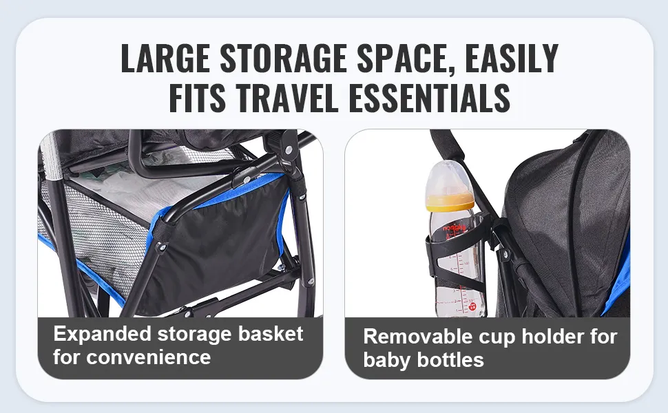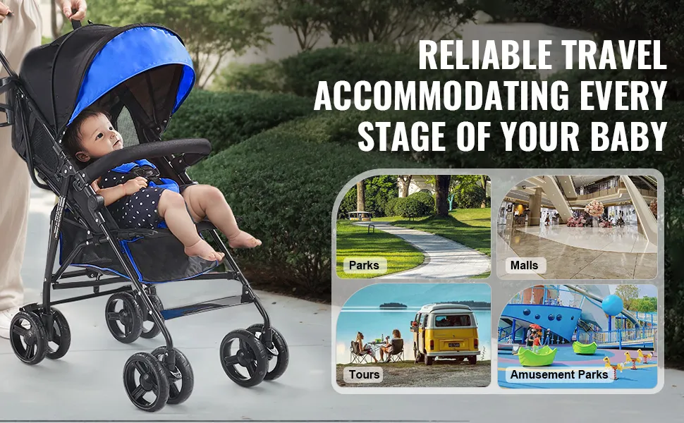 VEVOR Lekki wózek dziecięcy, kompaktowy, łatwy do składania z regulowanym oparciem, rama ze stali węglowej, duży kosz do przechowywania, wózek typu parasolka do podróży i nie tylko, czarno-niebieski