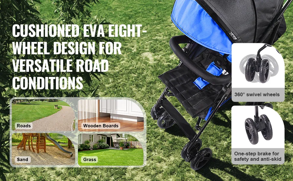 Wysoka nośność: Ten wózek, dzięki solidnej ramie ze stali węglowej, wytrzymuje obciążenie do 15 kg, dzięki czemu jest odpowiedni dla dzieci w wieku od 6 miesięcy do 3 lat. Wyposażony jest w osiem wysokoelastycznych opon EVA z wbudowaną amortyzacją, które radzą sobie z wyboistymi drogami i zapewniają komfortową jazdę.