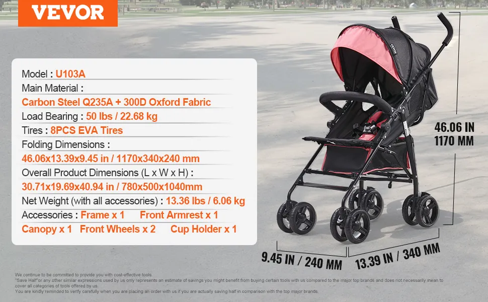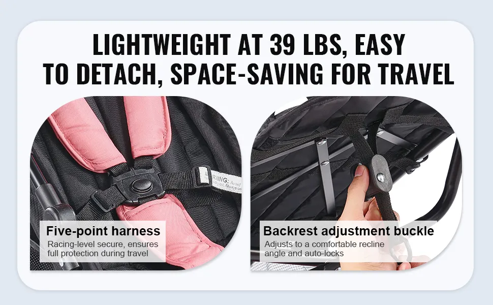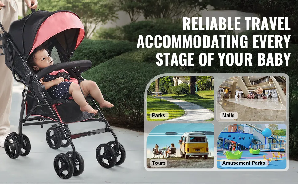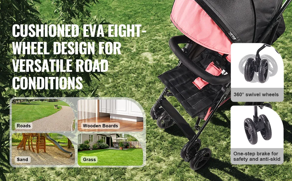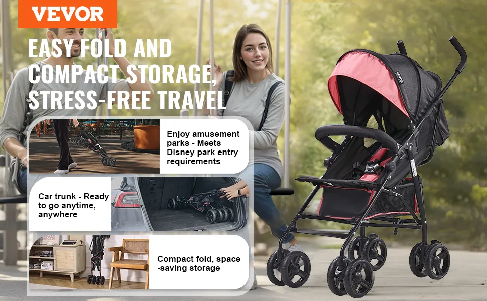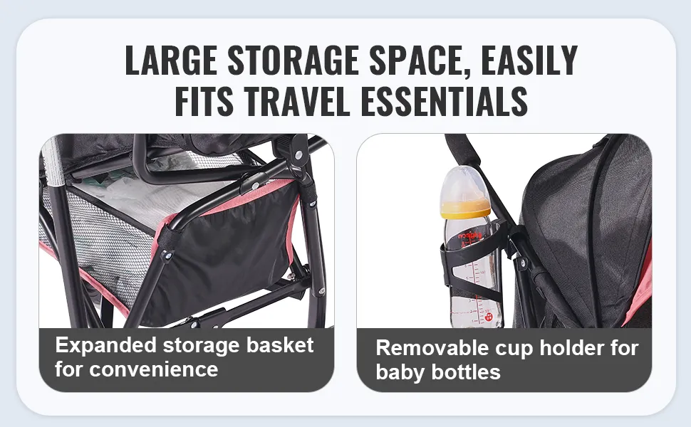 VEVOR Lekki wózek dziecięcy, kompaktowy, łatwy do składania z regulowanym oparciem, rama ze stali węglowej, duży kosz do przechowywania, wózek typu parasolka do podróży i nie tylko, czarno-różowy