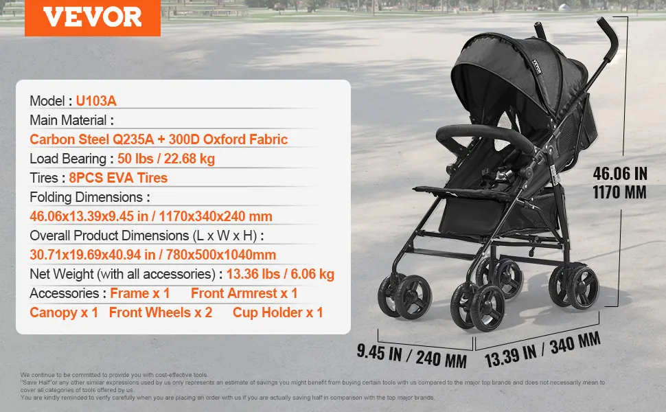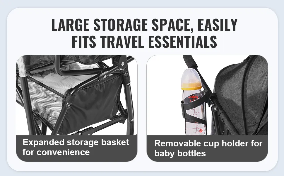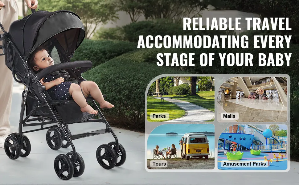 Lekki wózek VEVOR, kompaktowy, łatwy do złożenia, z regulowanym oparciem, rama ze stali węglowej, duży kosz do przechowywania, uchwyt na kubek, wózek typu parasolka do podróży i nie tylko, czarny