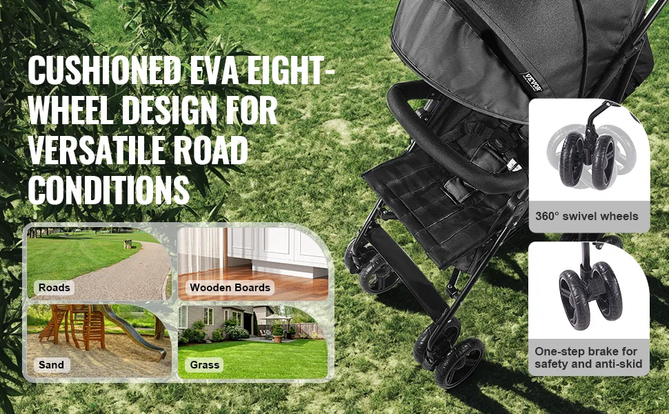 Wysoka nośność: Ten wózek, dzięki solidnej ramie ze stali węglowej, wytrzymuje obciążenie do 15 kg, dzięki czemu jest odpowiedni dla dzieci w wieku od 6 miesięcy do 3 lat. Wyposażony jest w osiem wysokoelastycznych opon EVA z wbudowaną amortyzacją, które radzą sobie z wyboistymi drogami i zapewniają komfortową jazdę.