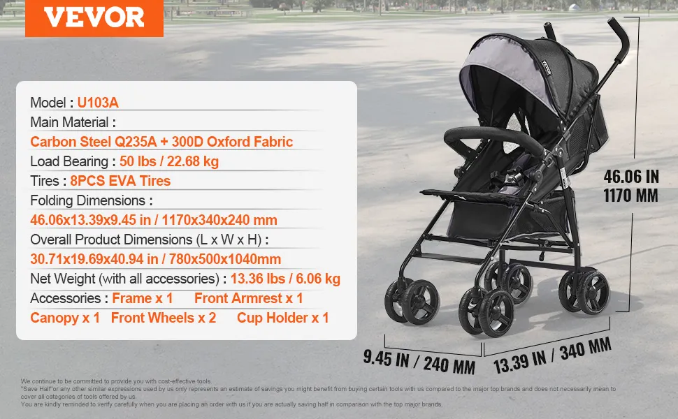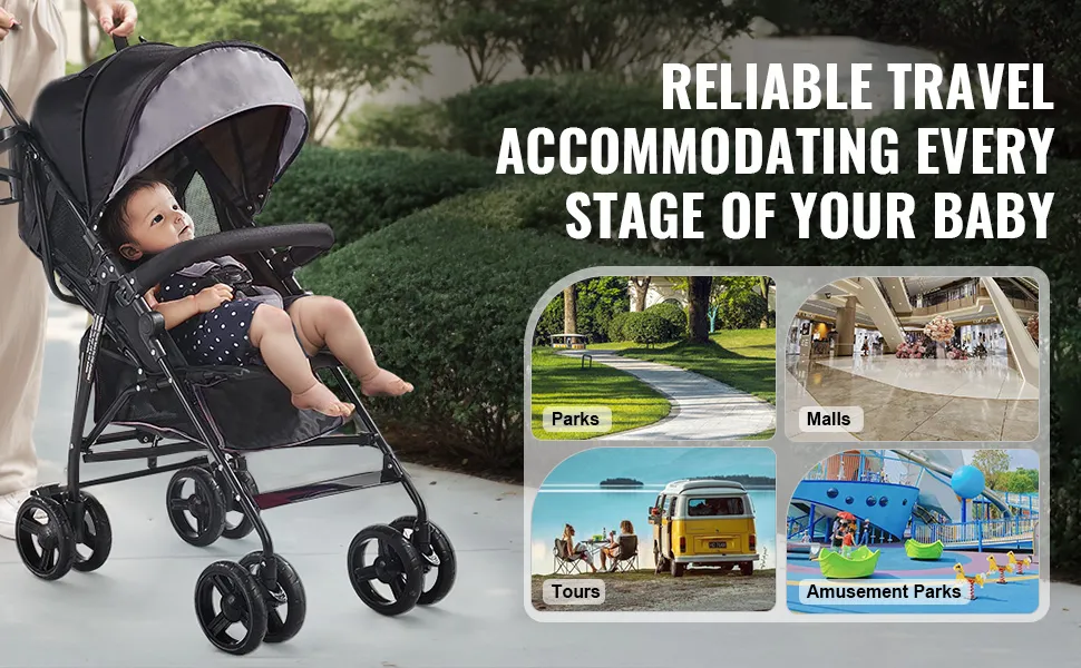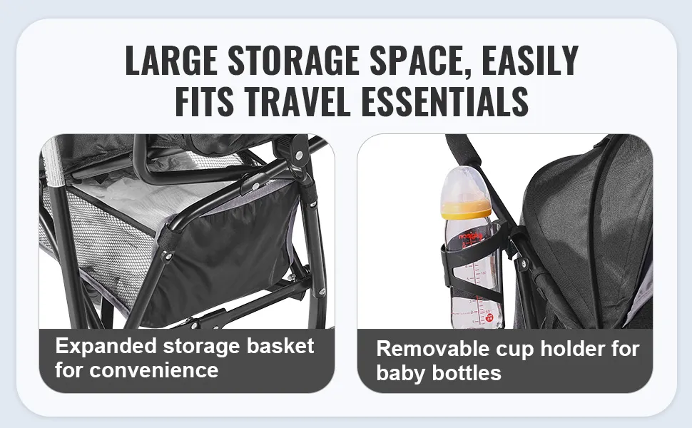 Lekki wózek VEVOR, kompaktowy, łatwy do złożenia, z regulowanym oparciem, daszkiem, ramą ze stali węglowej, dużym koszem do przechowywania, uchwytem na kubek, wózek podróżny typu parasol, jasnoszary/czarny